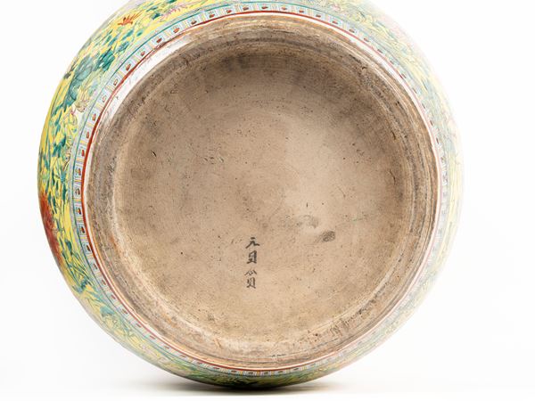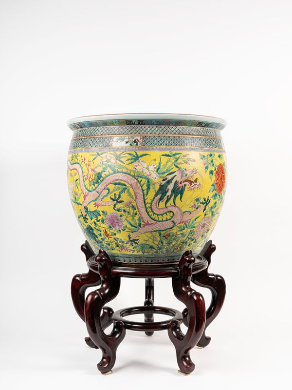 Ben dipinto all'esterno su fondo giallo con due draghi che si rincorrono tra i fiori, all'interno presenta pesci rossi.