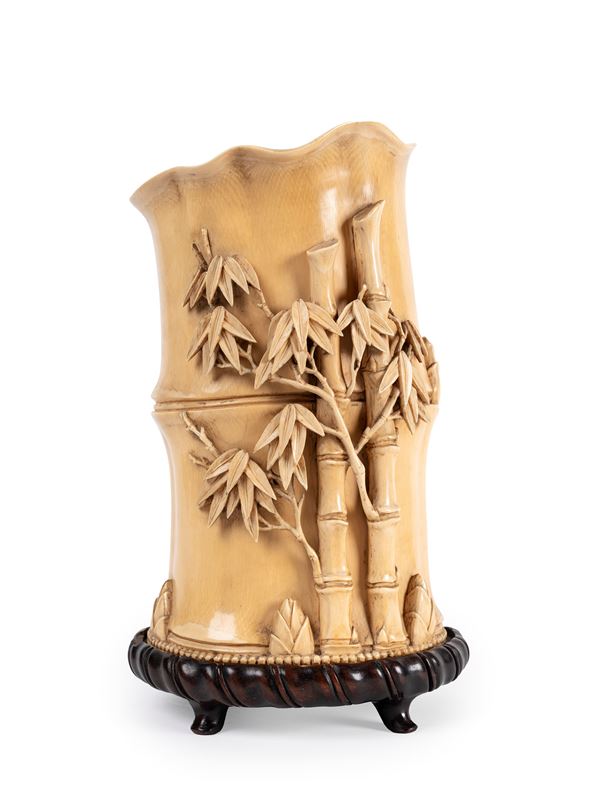 Vivamente scolpito in rilievo con motivi di bambù sul corpo in avorio, la base presenta il marchio apocrifo a quattro caratteri 'Da Ming Cheng Hua'. Completo di base in legno.