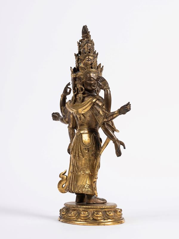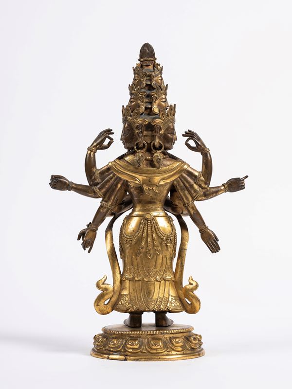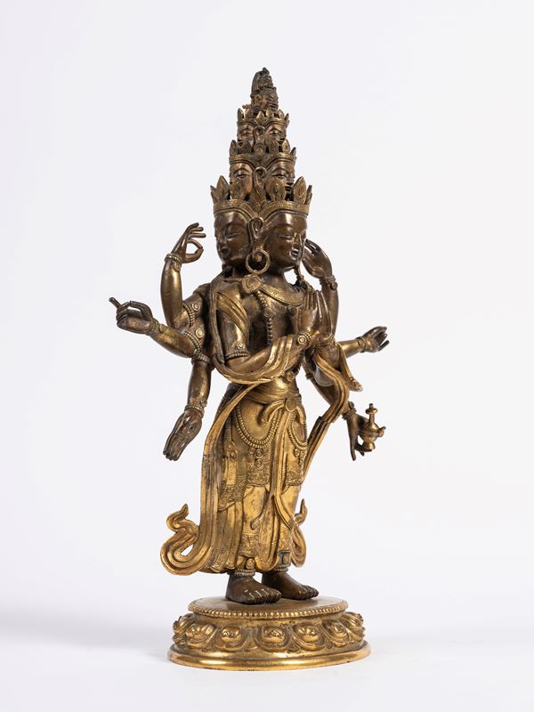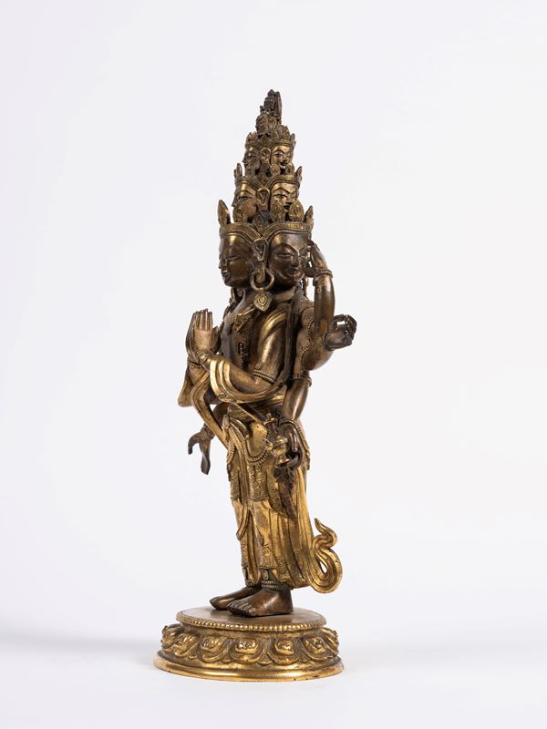 Raffigurante Avalokitesvara nella sua forma a undici facce (Ekadasamukha), in piedi su una base a fiore di loto. Raffigurato con otto braccia, le due principali in atmanjalimudra e le altre in diversi mudra mentre nella mano in basso a sinistra tiene un kundika. Indossa una veste drappeggiata e ben cesellata e porta vistosi gioielli e diademi.