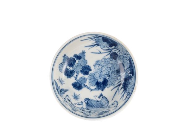 Decorato in blu sotto coperta, raffigura una gallina con sei pulcini tra peonie, sulla base reca il marchio a sei caratteri in blu sotto coperta Jiang Xi Ci Ye Gong Si (江西瓷业公司).