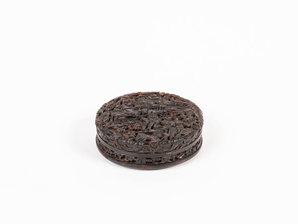 Intagliata sul corpo e sul coperchio con personaggi e paesaggi.