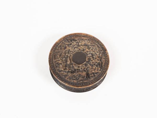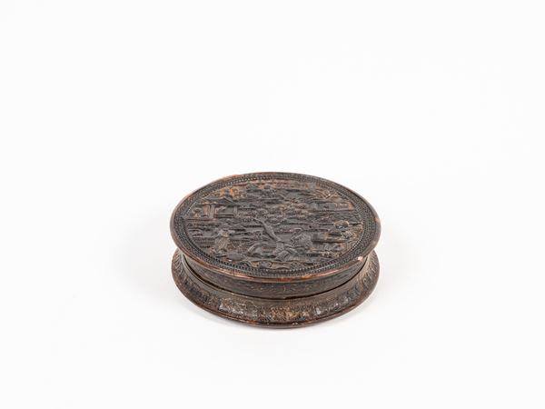 Intagliata sul corpo e sul coperchio con personaggi e paesaggi.