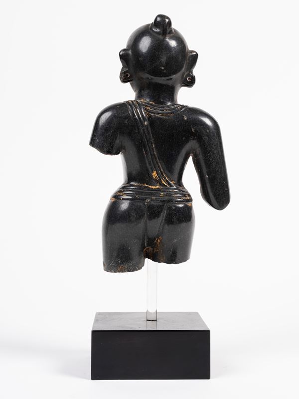 Raffigurante Krishna, il busto è ben modellato, il petto decorato da un bel medaglione e i tre cordoni dell’iniziazione brahmanica.
