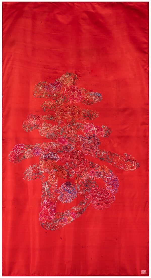 Rappresentante il carattere cinese "Shou" (longevità) su sfondo rosso.