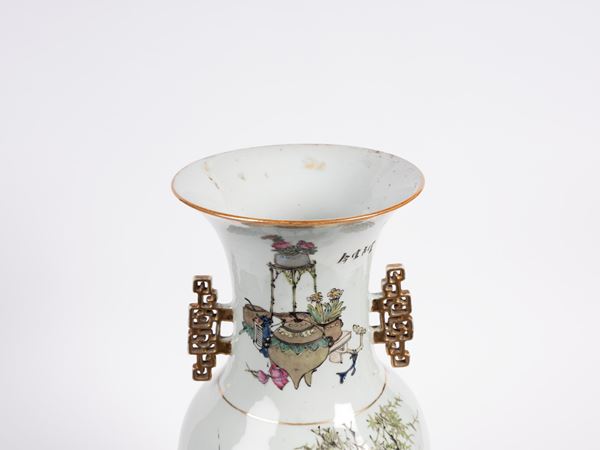 Raffigurante figure in un paesaggio sul corpo del vaso, con motivi bogu sul collo, e due orecchie dorate. Presenta iscrizioni tra cui Ding Yi (丁已年) corrispondente all'anno 1917.