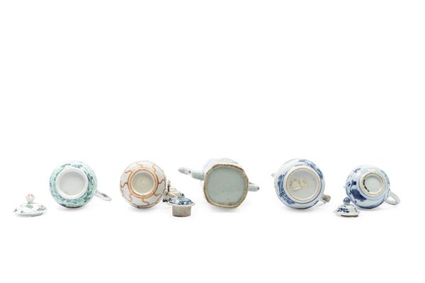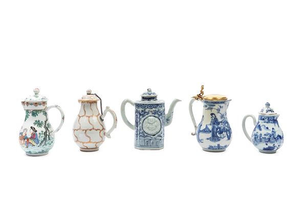 Una dalla rara decorazione famiglia rosa con quattro soggetti europei che conversano in un giardino (periodo Qianlong), due presentano personaggi in blu sotto coperta (periodo Kangxi), una con decorazione a forma di petali in oro e rosso ferro (XVIII secolo), una a sezione quadrata modellata al centro con due medaglioni a forma di ragazzi e con motivi floreali in blu sotto coperta sul corpo (periodo Kangxi).