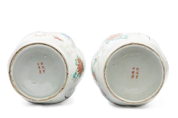 A forma di bottiglia con corpo lobato raffigurante galli decorati in policromia, circondati da cristantemi di varie tipologie. firmati sotto la base.