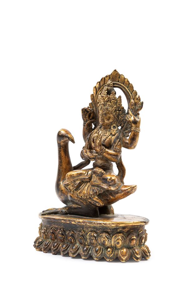 Raffigurante Sarasvati che cavalca un'oca, tiene nelle sue quattro mani attributi.