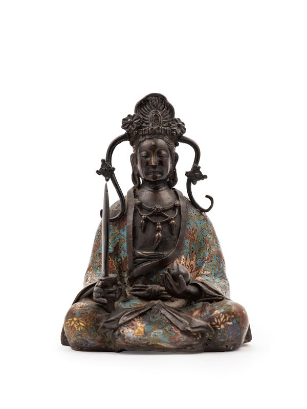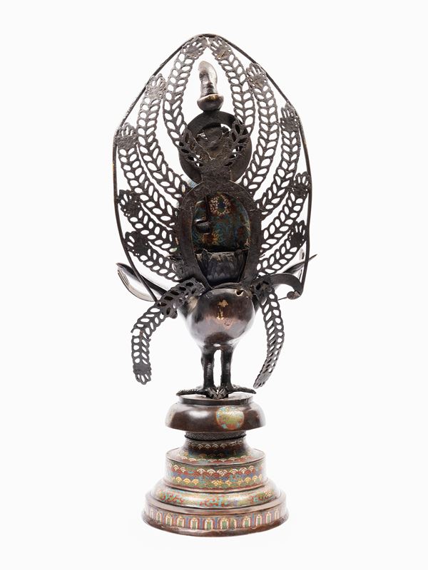Raffigurante Guanyin assisa su un fiore di loto mentre cavalca un pavone; la base circolare a più livelli è finemente decorata con smalti cloisonné con decori floreali e nuvole, il pavone con le ali smaltate, la Guanyin con una elegante veste decorata in smalto con fiori di loto, regge una spada e una pesca, il suo volto è adornato da un elegante copricapo; alle sue spalle una grossa aura reticolata a motivi floreali è sormontata da una figura di buddha assiso su un fiore di loto.