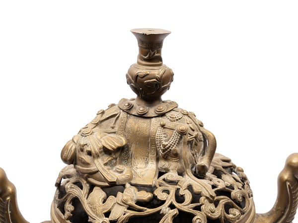 Poggiante su tre piedini zoomorfi, corpo decorato con motivi floreali, due anse a guisa di proboscide, fascia a motivo a greche, coperchio traforato, sormontato da elefante accovacciato con vaso, base in legno.