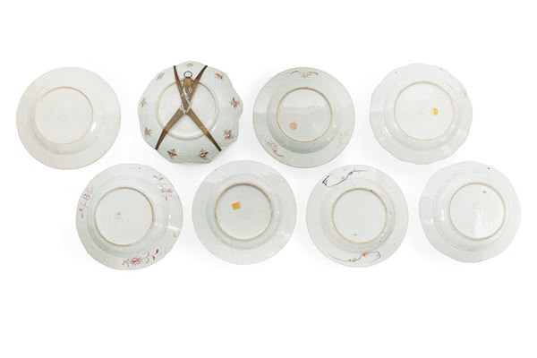 Uno imari con motivi floreali, uno lobato a forma di fiore con nove petali in stile famiglia rosa con motivi floreali, uno in blu sotto coperta e famiglia rosa con un paesaggio, quattro famiglia rosa con fiori e oggetti antichi.