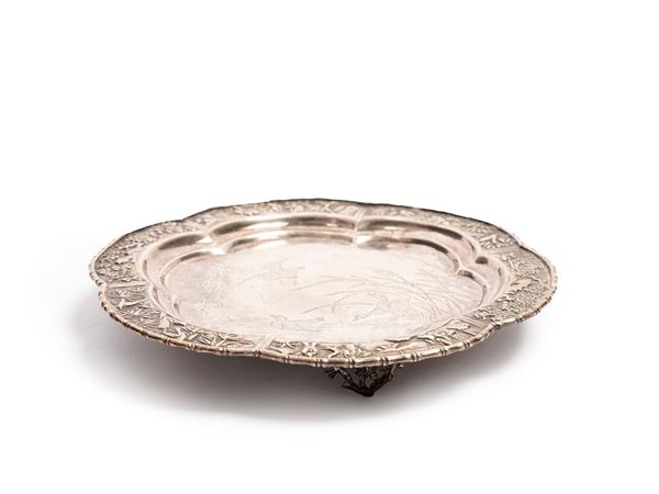 Di forma polilobata, poggiante su quattro piedini, la tesa finemente sbalzata a riserve decorate con motivi floreali e fogliacei e figure in un giardino con pagode; il centro del piatto inciso con anatre in uno stagno e un'iscrizione; argentiere Luen Wo, Shanghai. Peso g 225.