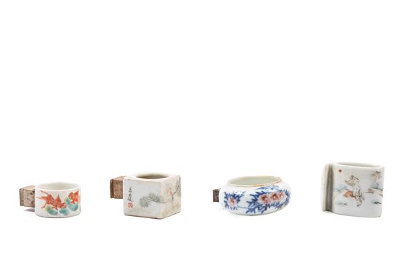 Di forme diverse, raffigurano figure che giocano in un giardino, tre carpe tra onde in rilievo, un paesaggio floreale con uccellini e due uccellini in porcellana Qianjang.