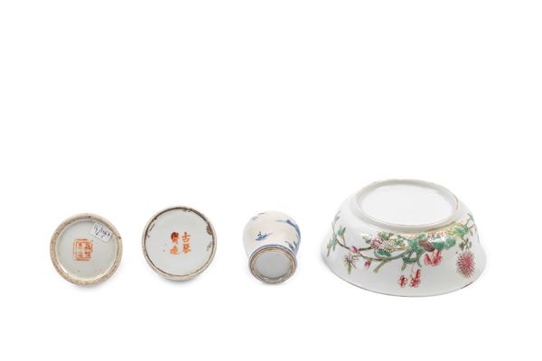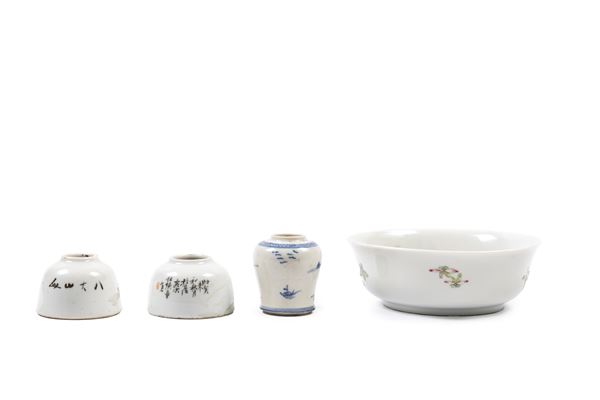Composto da due calamai in porcellana Qianjiang raffiguranti figure in un paesaggio; un piccolo vaso in porcellana bianca e blu raffigurante paesaggio con pagode e pescatore; la ciotola in porcellana famiglia rosa decorata a motivi floreali.