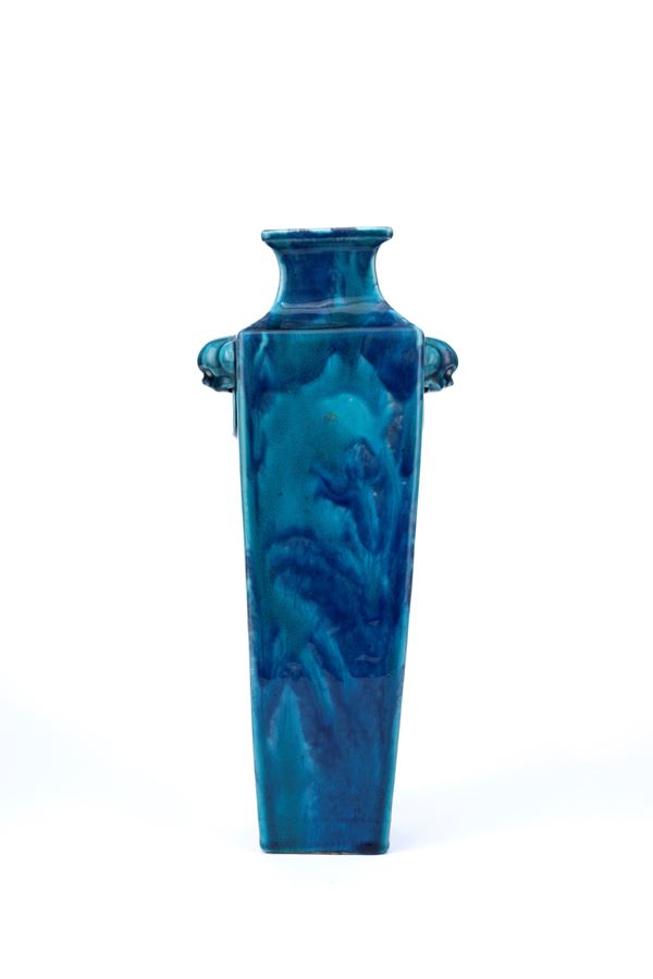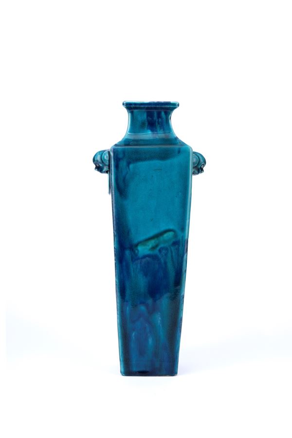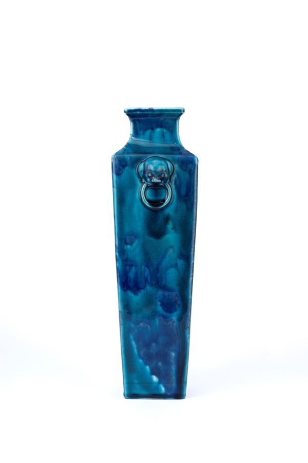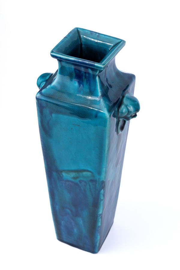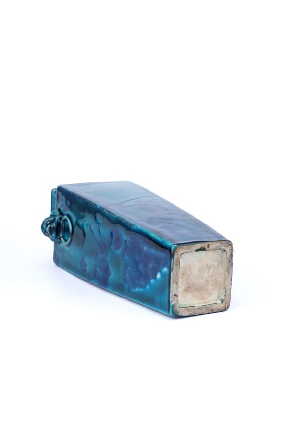 Di sezione quadrata con corpo affusolato, sui lati sono applicate due anse a forma di testa di leone che tengono in bocca un anello; è completamente ricoperto da uno smalto turchese con sfumature blu scure.