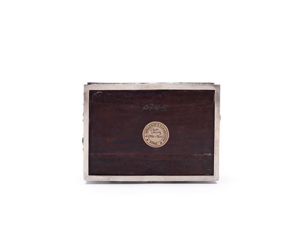 Di sezione rettangolare, sui lati è finemente cesellata con motivi floreali e applicazioni in pietre dure, il coperchio è decorato con smalti e pietre dure raffiguranti un drago attorcigliato a quattro artigli tra nuvole, onde e rocce. Peso tot. g 569.