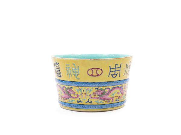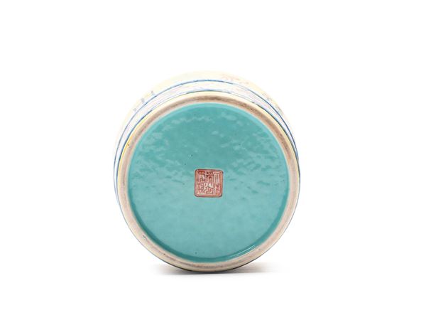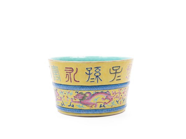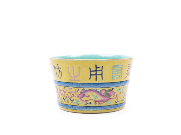 La superficie esterna è decorata con una fascia di caratteri in scrittura sigillare, al di sopra di sottili bande rilevate blu. Più in basso si trovano due coppie di qilong tra tralci di foglie. L'interno smaltato in turchese così come la base, che al centro reca una marchio quadrato in rosso ferro a sei caratteri dell'Imperatore Daoguang.