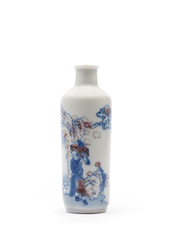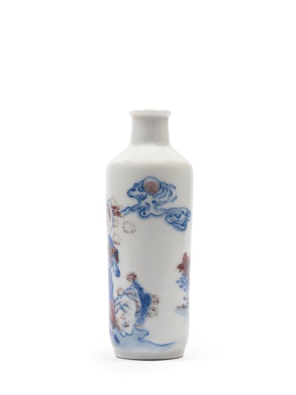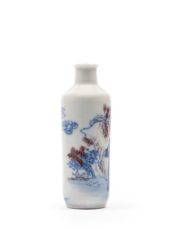 SNUFF BOTTLE IN PORCELLANA BLU E ROSSO SOTTO COPERTA, Cina, dinastia Qing, fine XIX secolo