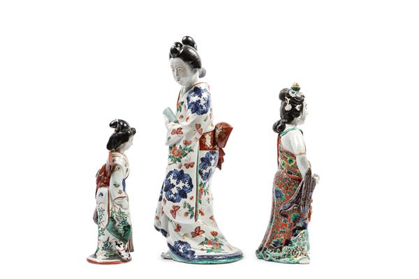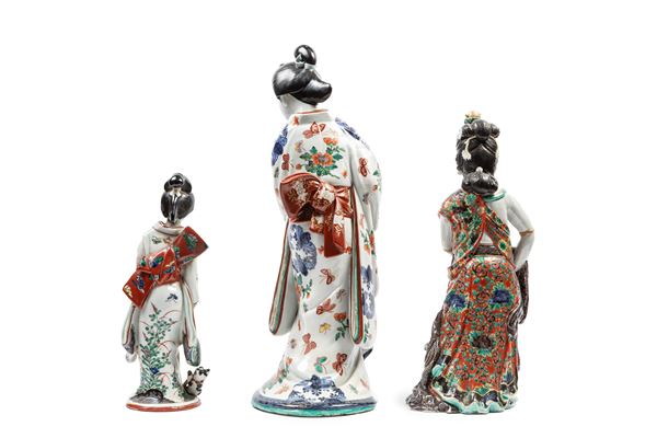 Due figure rappresentano eleganti geishe, vestite con raffinati kimono decorati nei classici toni della porcellana Imari, con motivi floreali e farfalle. La terza figura raffigura una divinità in porcellana Kutani, con il capo ornato da una ricca acconciatura e una tiara a forma di fiore di loto; l’ampia veste panneggiata è decorata con peonie e motivi floreali.