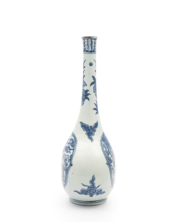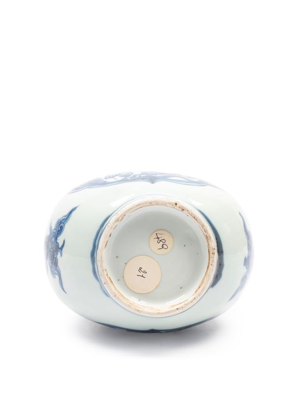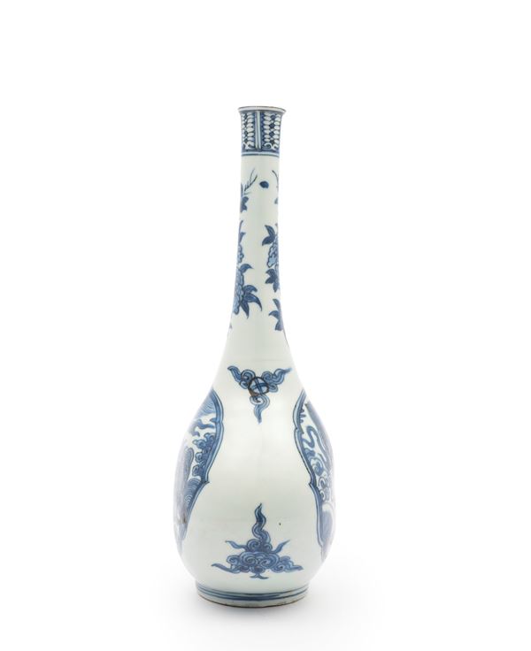Il corpo globulare compresso è ben dipinto in blu sotto coperta con due riserve lobate, circondate da nuvole a tre punte, all'interno delle quali sono raffigurati un qilin e un leone tra nuvole e onde; il collo stretto e lungo è decorato con rami di fiori.