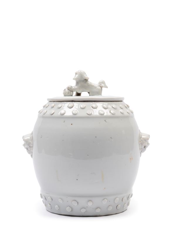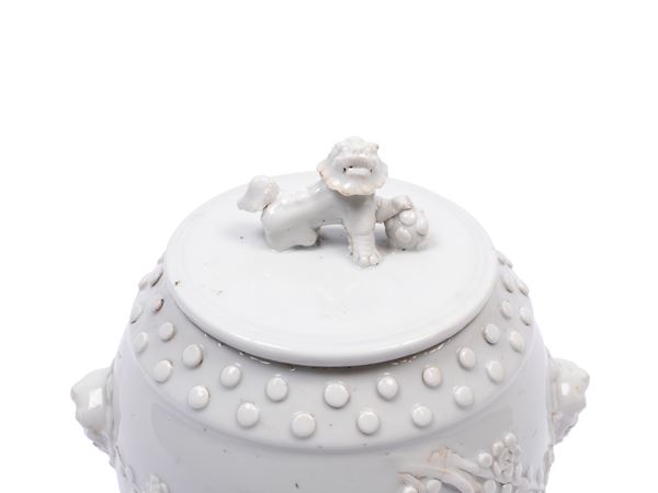 A forma di tamburo, con motivi floreali applicati sul corpo e anse a testa di leone; il coperchio culmina in un kirin.