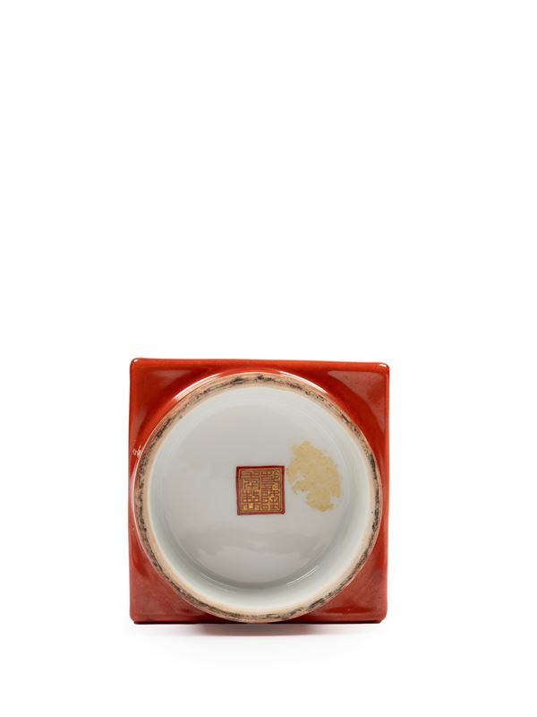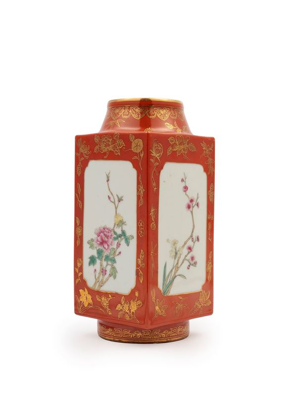 A sezione quadrata che si regge su un piede rialzato e che si restringe in un collo corto e scampanato, è decorato su ogni faccia con un riquadro nel quale sono raffigurati fiori, il tutto su un fondo corallo dorato con motivi floreali; al centro della base reca il marchio apocrifo sigillare dorato in rosso ferro a quattro caratteri dell'Imperatore Qianlong.
