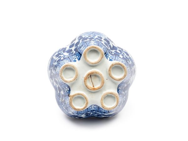Con alto fusto centrale con terminale a capocchia di fiore che parte da una base lobata che racchiude cinque aperture; dipinto in blu sotto coperta con fiori, foglie e fenici.