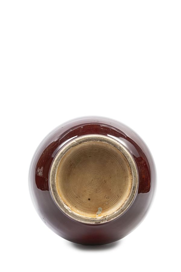 Dalla forma a bottiglia con corpo panciuto, collo lungo e bordo svasato, è completamente ricoperto da uno smalto rosso ad eccezione della base.