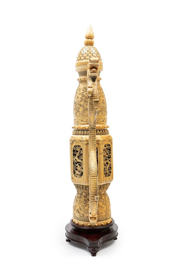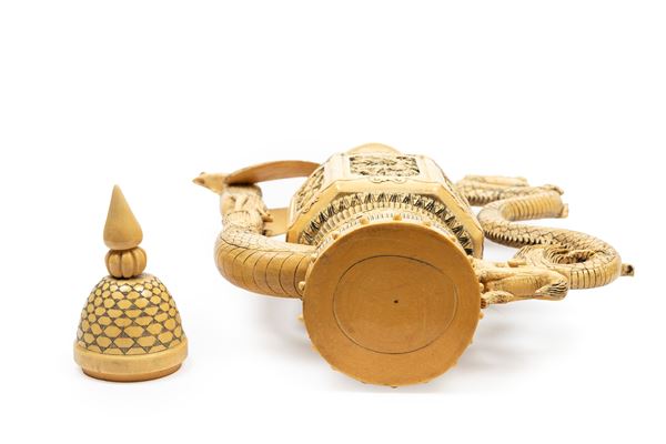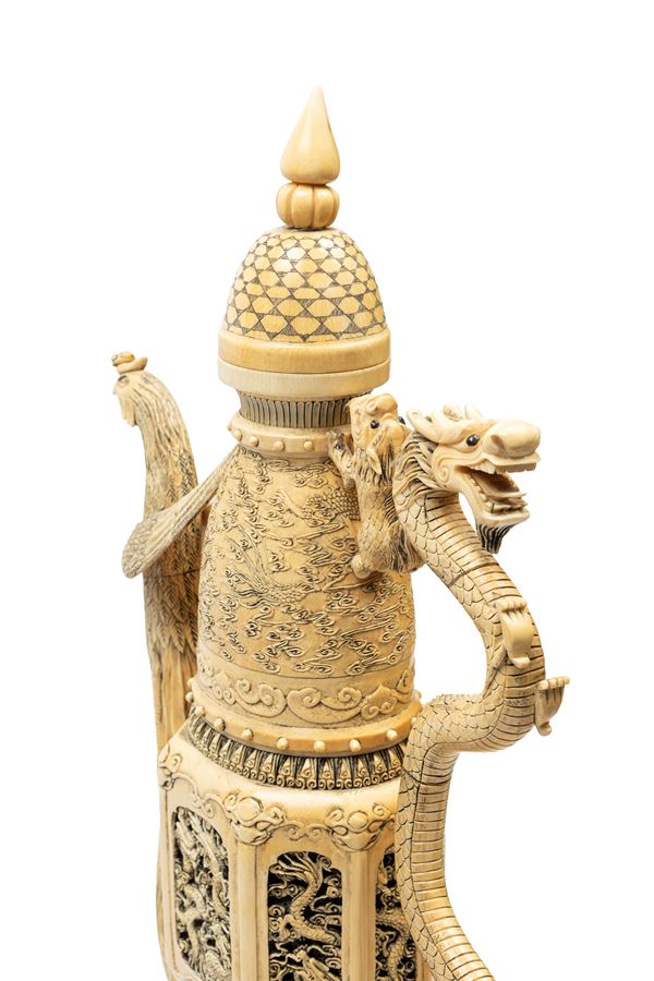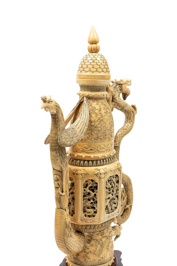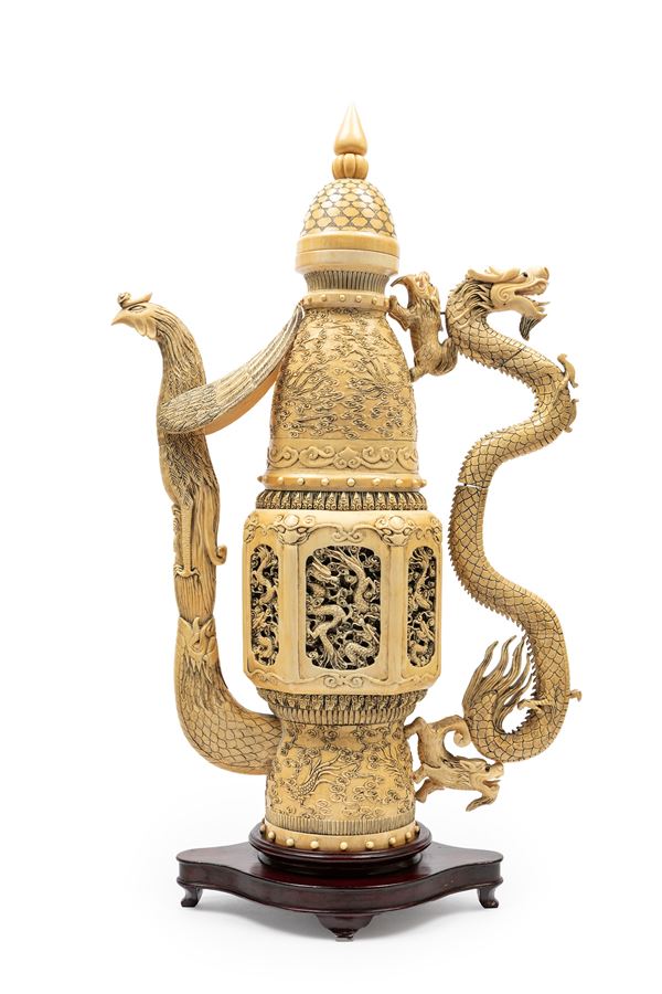 Con prese raffiguranti un drago e una fenice, corpo con decori incisi a bassorilievo.
