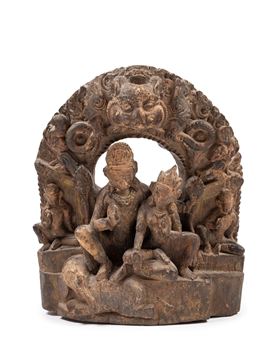 Raffigurante Shiva e Parvati seduti in posizione benedicente e accompagnati da due accoliti sotto un tempietto ad arco, sormontato da figura di Garuda.