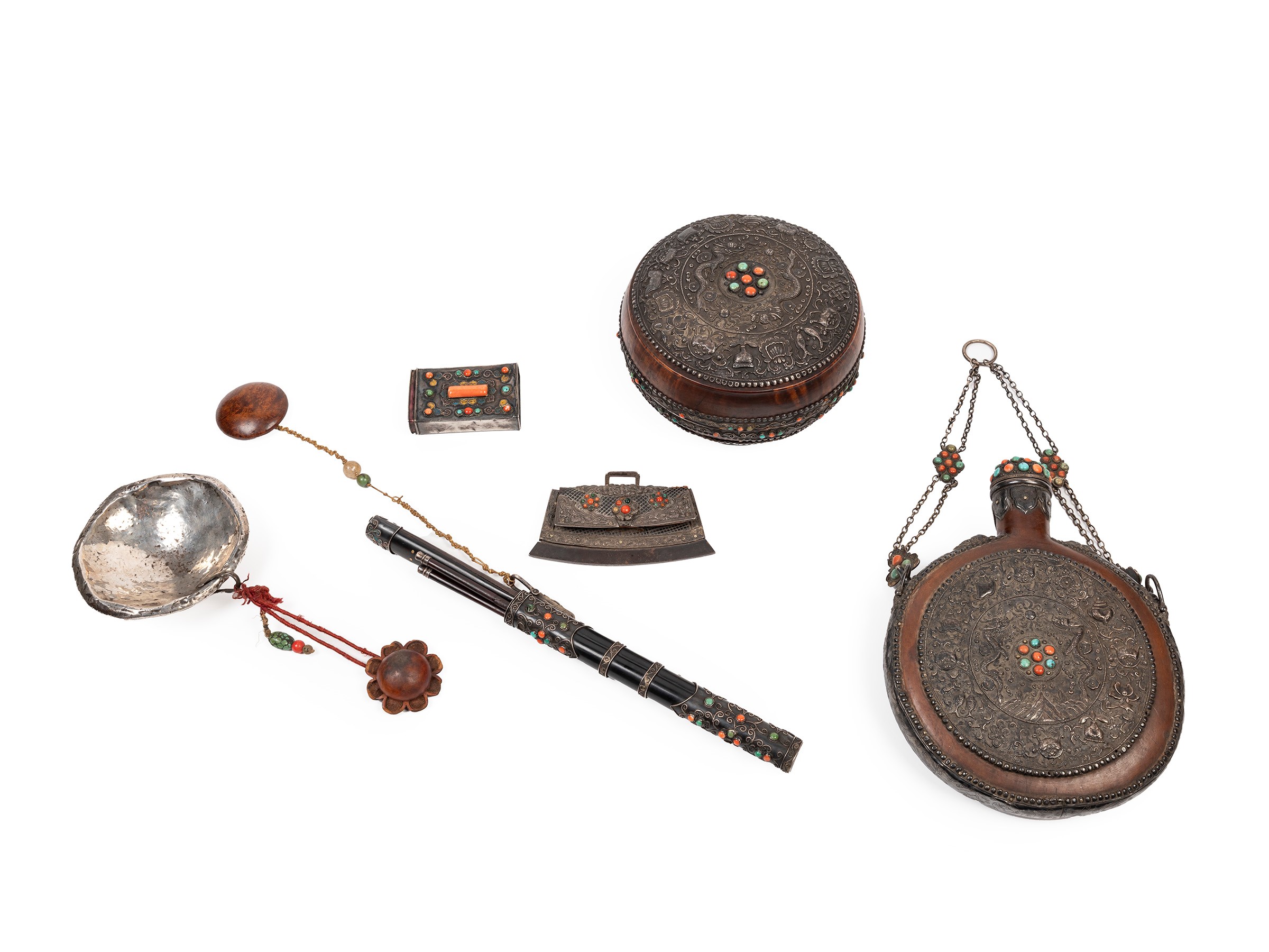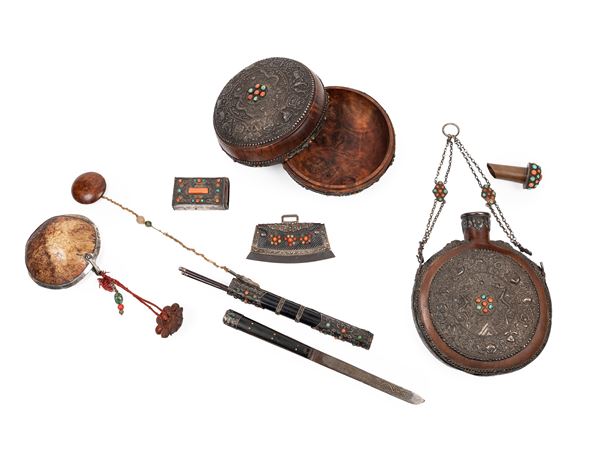 Composto da un porta posate intarsiato in argento e incastonato con pietre dure (l cm 21,5), contenente un coltello (l cm 30,5), anch'esso finemente intagliato e decorato, e due bacchette per il riso; un capala in osso con rivestimento in argento (l cm 12); un contenitore tsampa in legno decorato a sbalzo in argento con draghi (d cm 18), oggetti della tradizione taoista e Garuda; una fiasca in legno con il medesimo decoro della scatola (h cm 25); una borsetta/acciarino riccamente decorata con un raffinato bordo con nuvole e draghi in argento e arricchita con dei fiori in pietre dure (l cm 13,5) e una scatolina con intarsi in pietra dura (l cm 8).