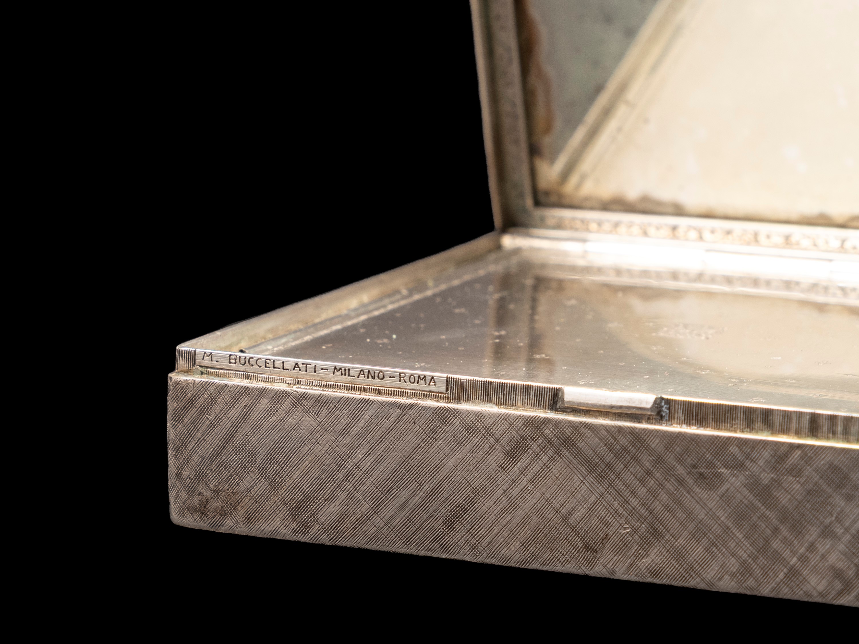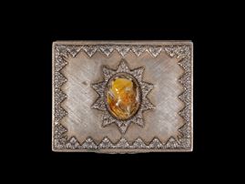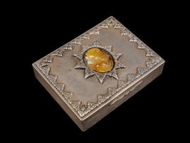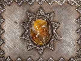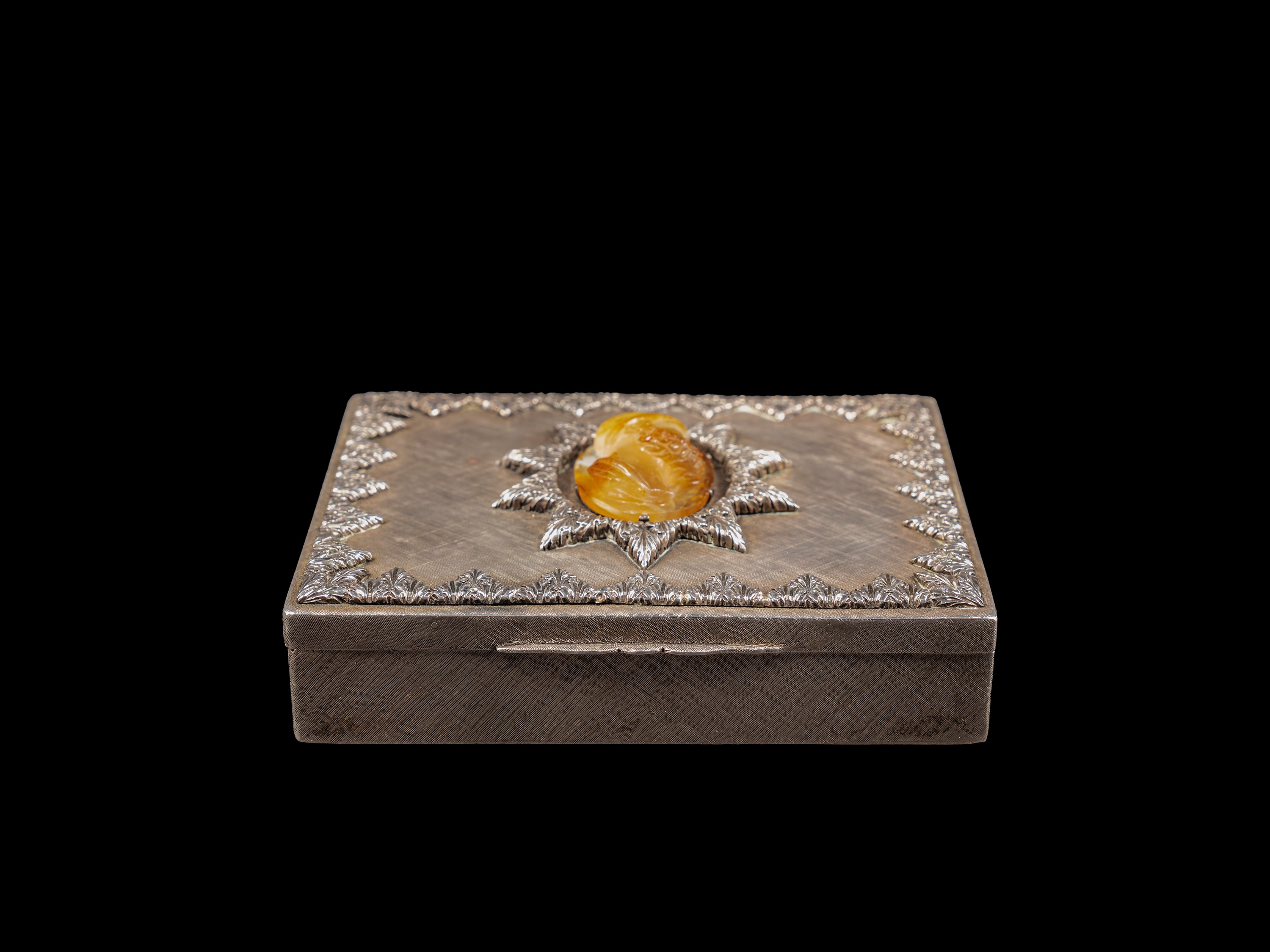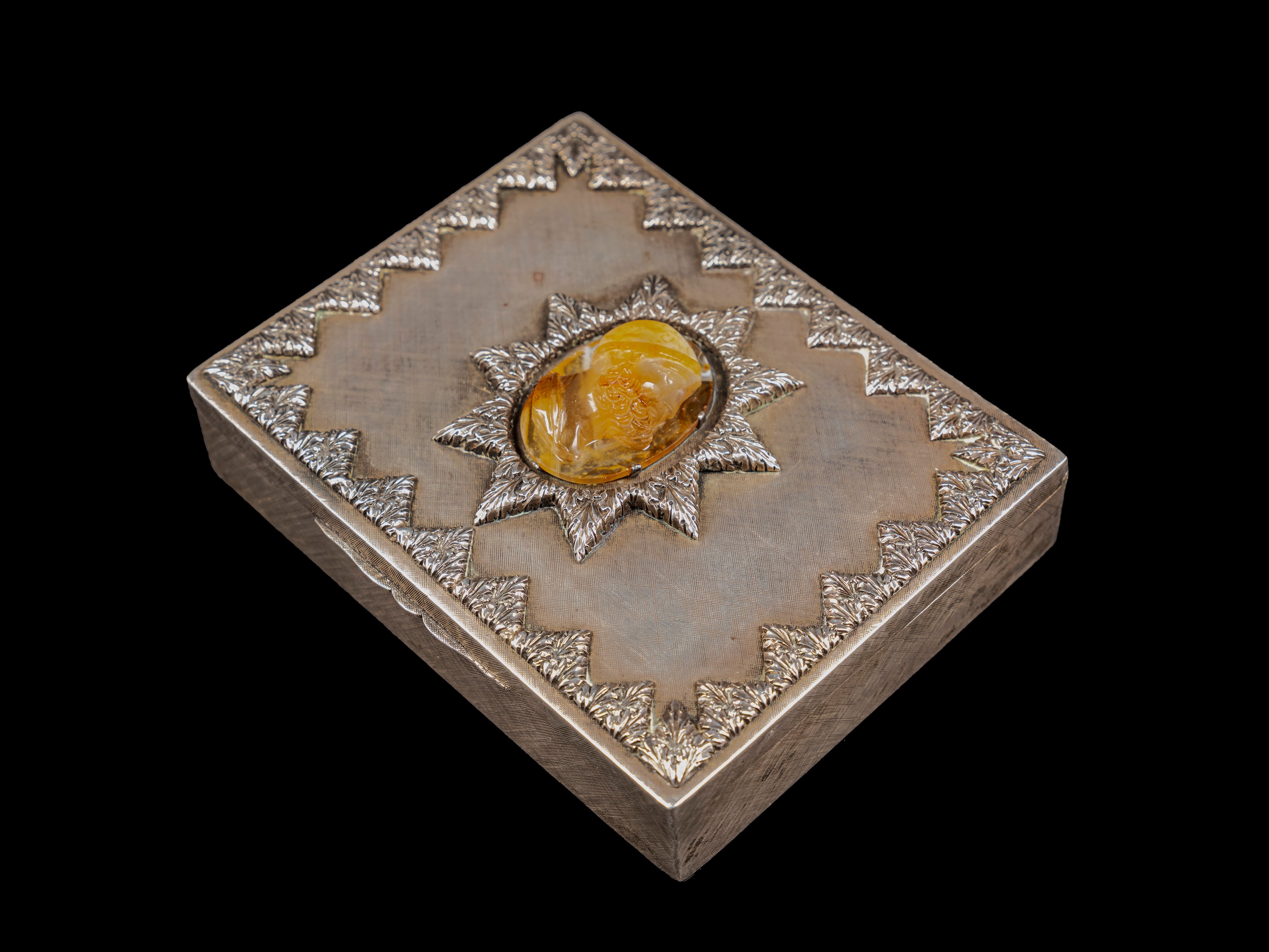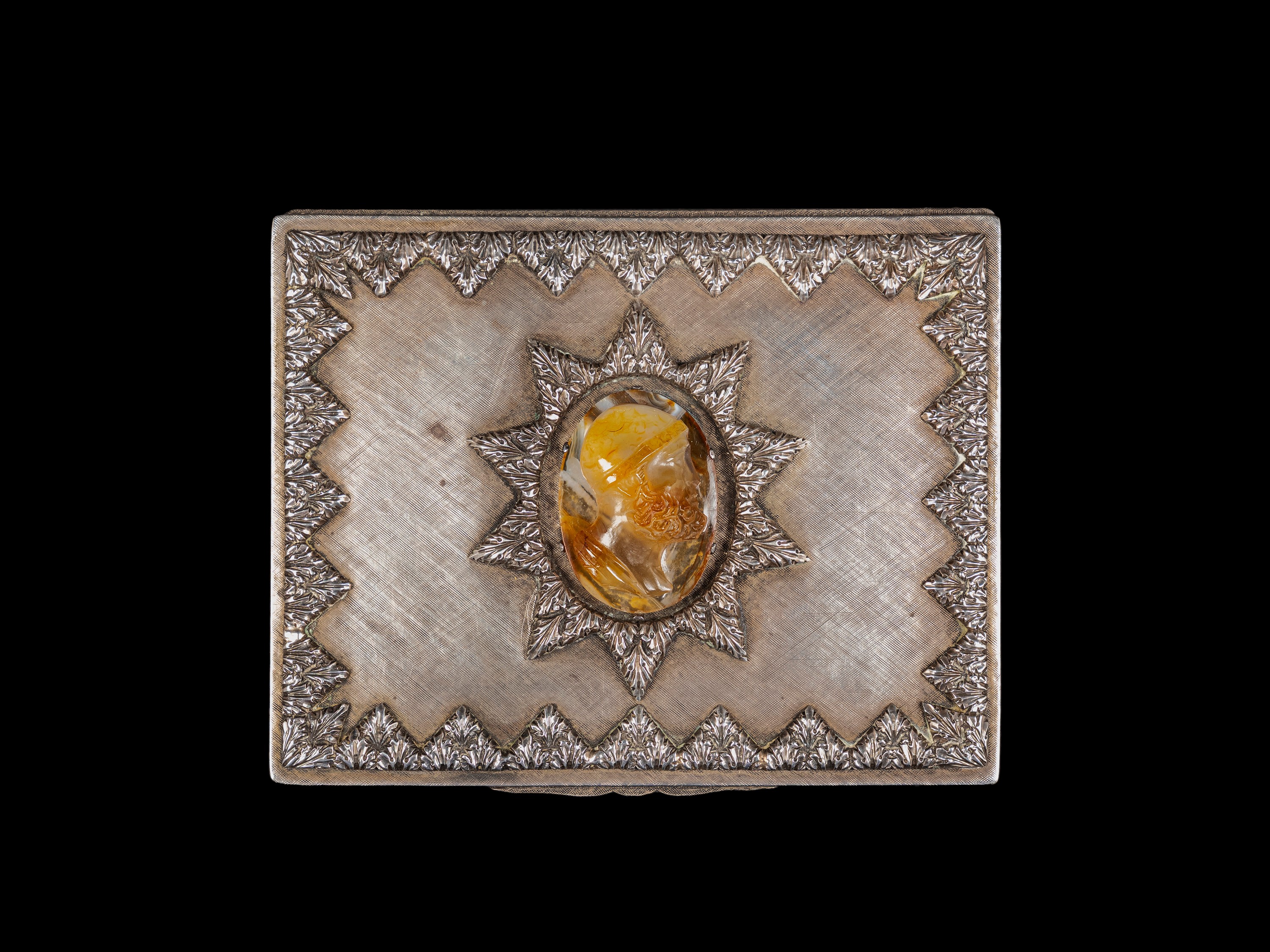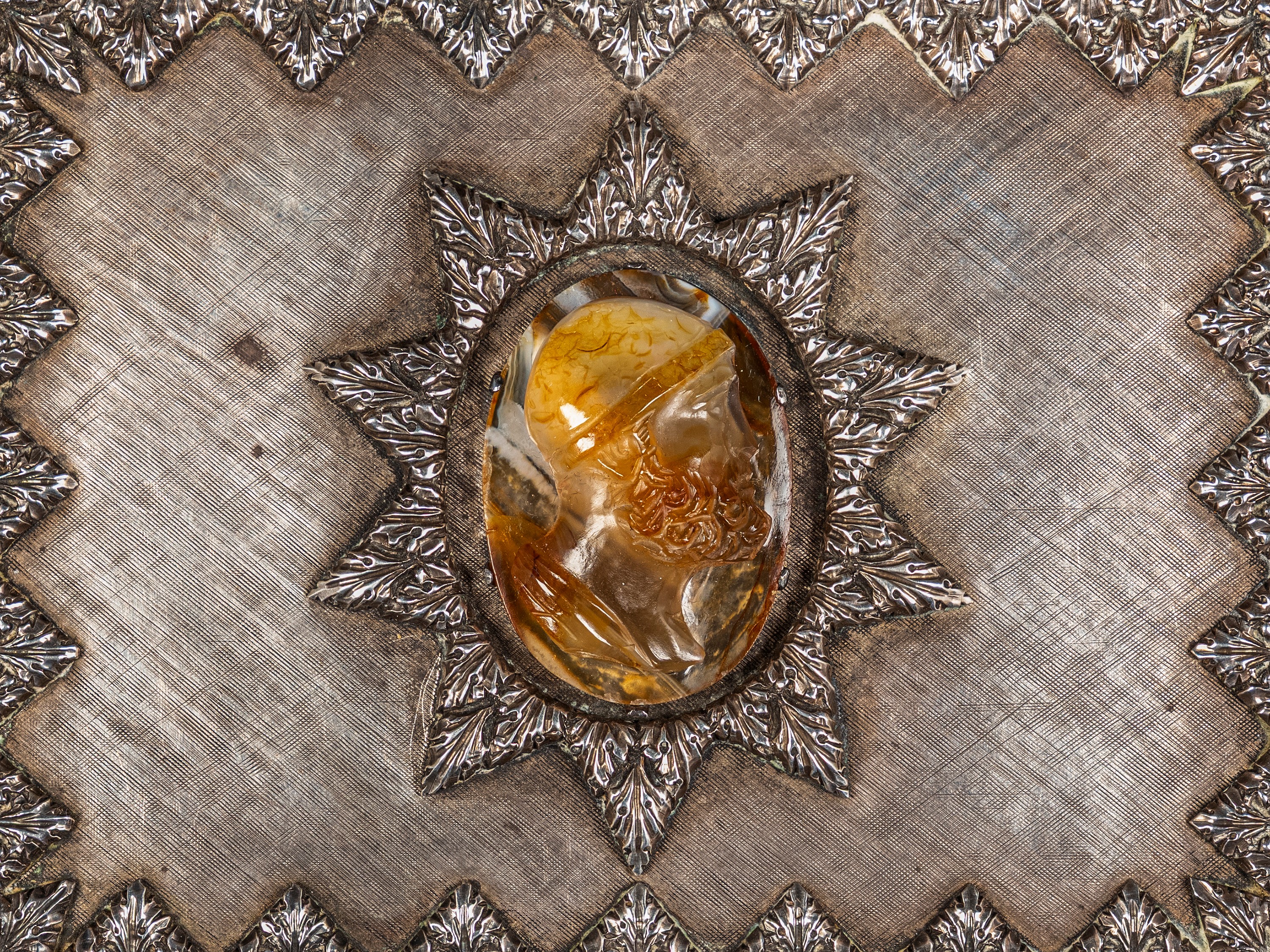 Finemente cesellata a motivi fogliacei e centrata da un cammeo incastonato in agata raffigurante un uomo orientale. Peso g 334.