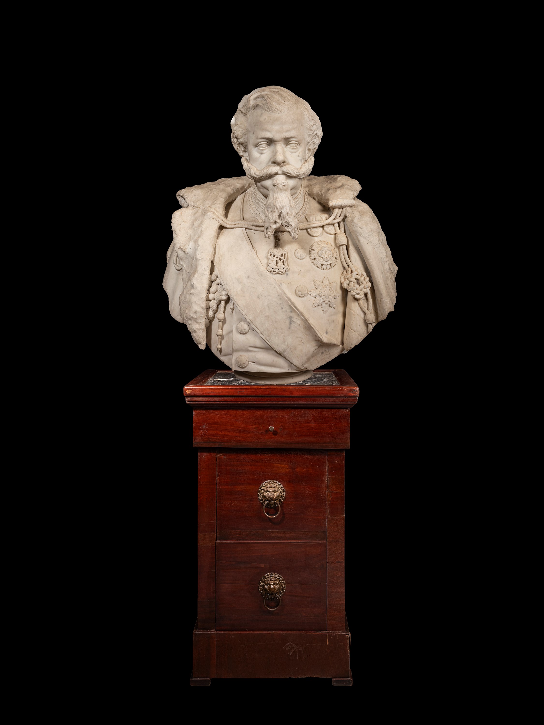 Raffigurante il re Vittorio Emanuele II in abiti militari; il viso si distingue per la presenza dei folti baffi e della lunga barba a punta. Il sovrano indossa una divisa militare impreziosita da medaglie e placche degli ordini dinastici, in particolare dell’Ordine Mauriziano e della Santissima Annunziata. L’opera evidenzia un’accurata resa fisionomica e una minuziosa definizione dei dettagli dell’uniforme. Particolarmente raffinata la modellazione del panneggio, degli ornamenti e dei tratti de volto del sovrano.