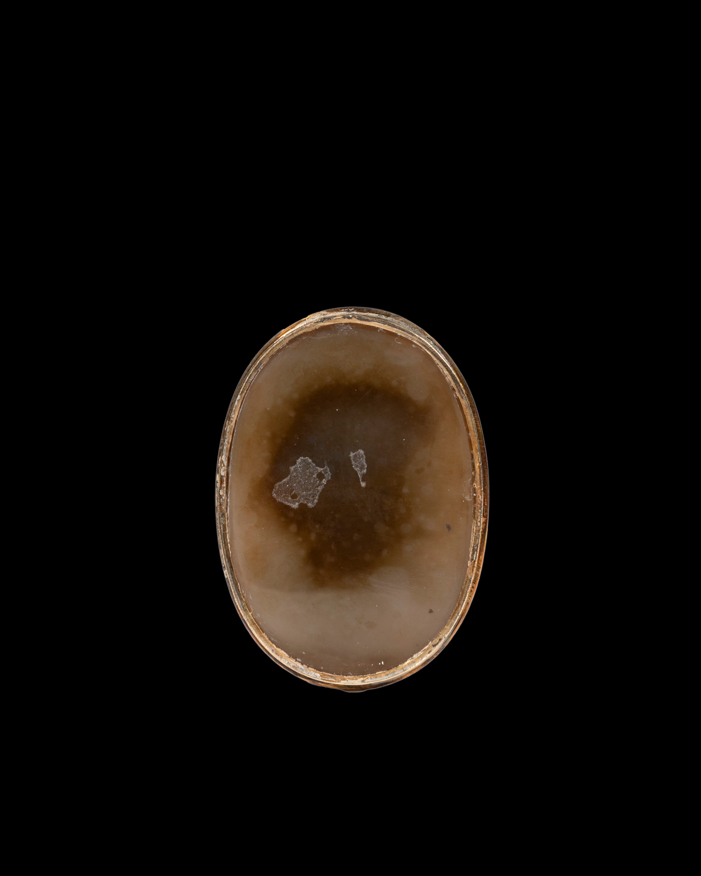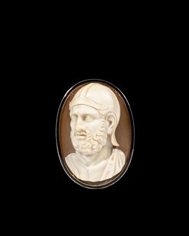Raffigurante volto di guerriero claassico entro cornice in oro basso e smalto nero.