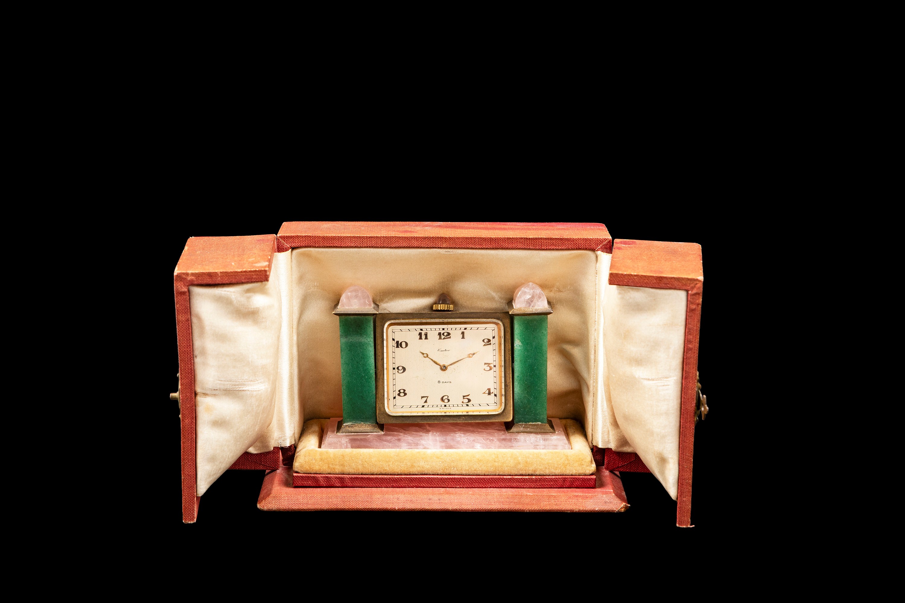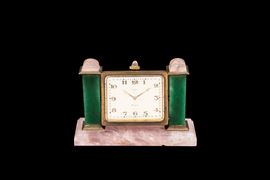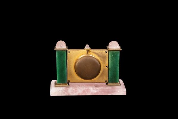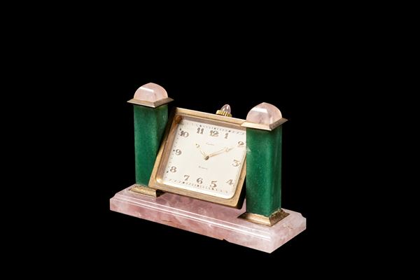 Di forma rettangolare con angoli smussati, su fondo argentato. Il corpo centrale dell’orologio è affiancato da due colonne laterali in avventurina di sezione cilindrica, sormontate da eleganti terminali a cabochon in quarzo rosa. La base, anch’essa rettangolare, riprende il motivo dei terminali ed è realizzata in quarzo rosa. Entro astuccio.