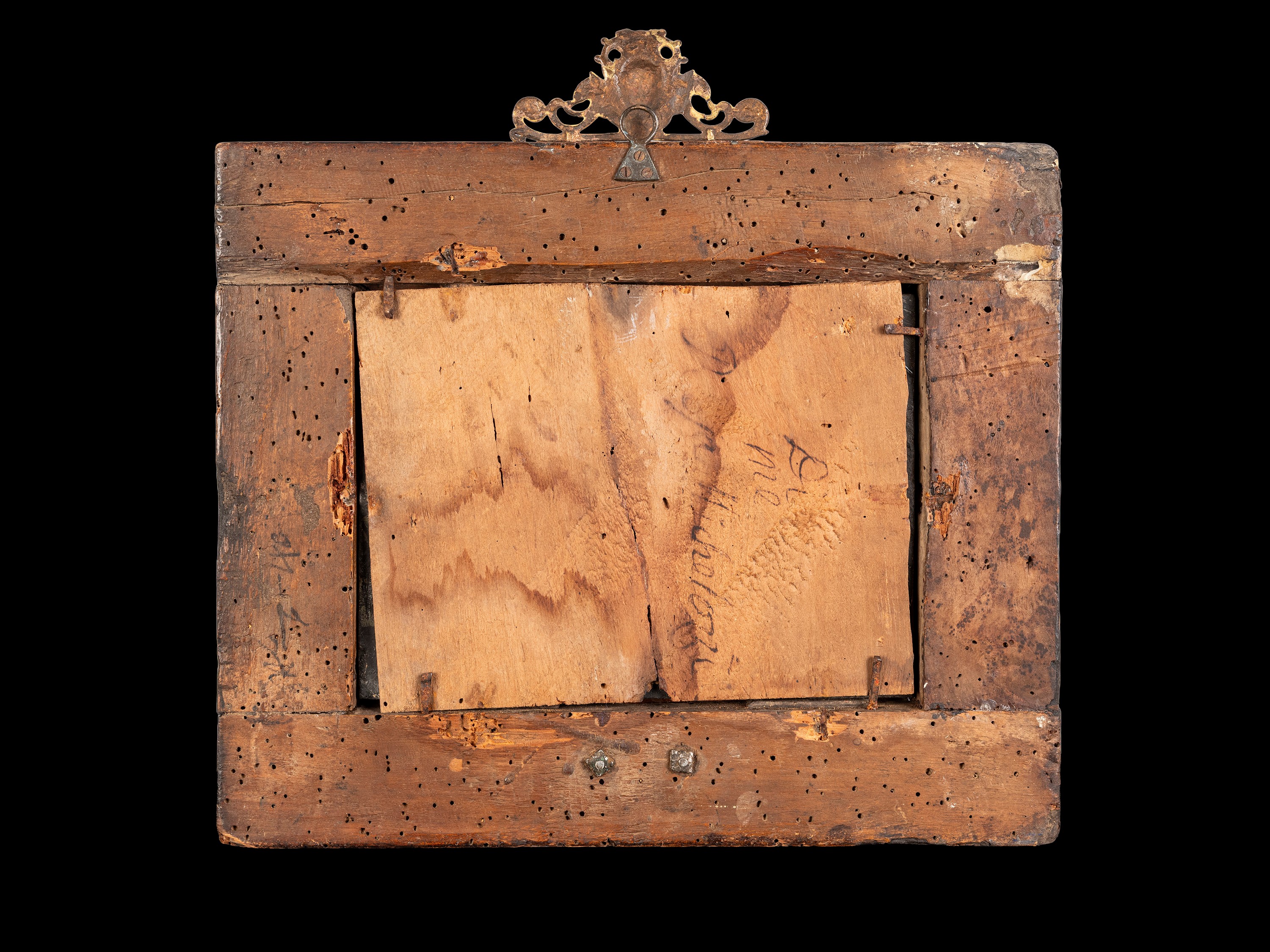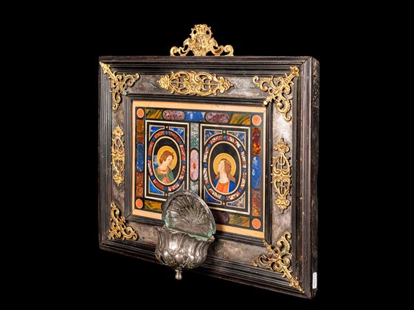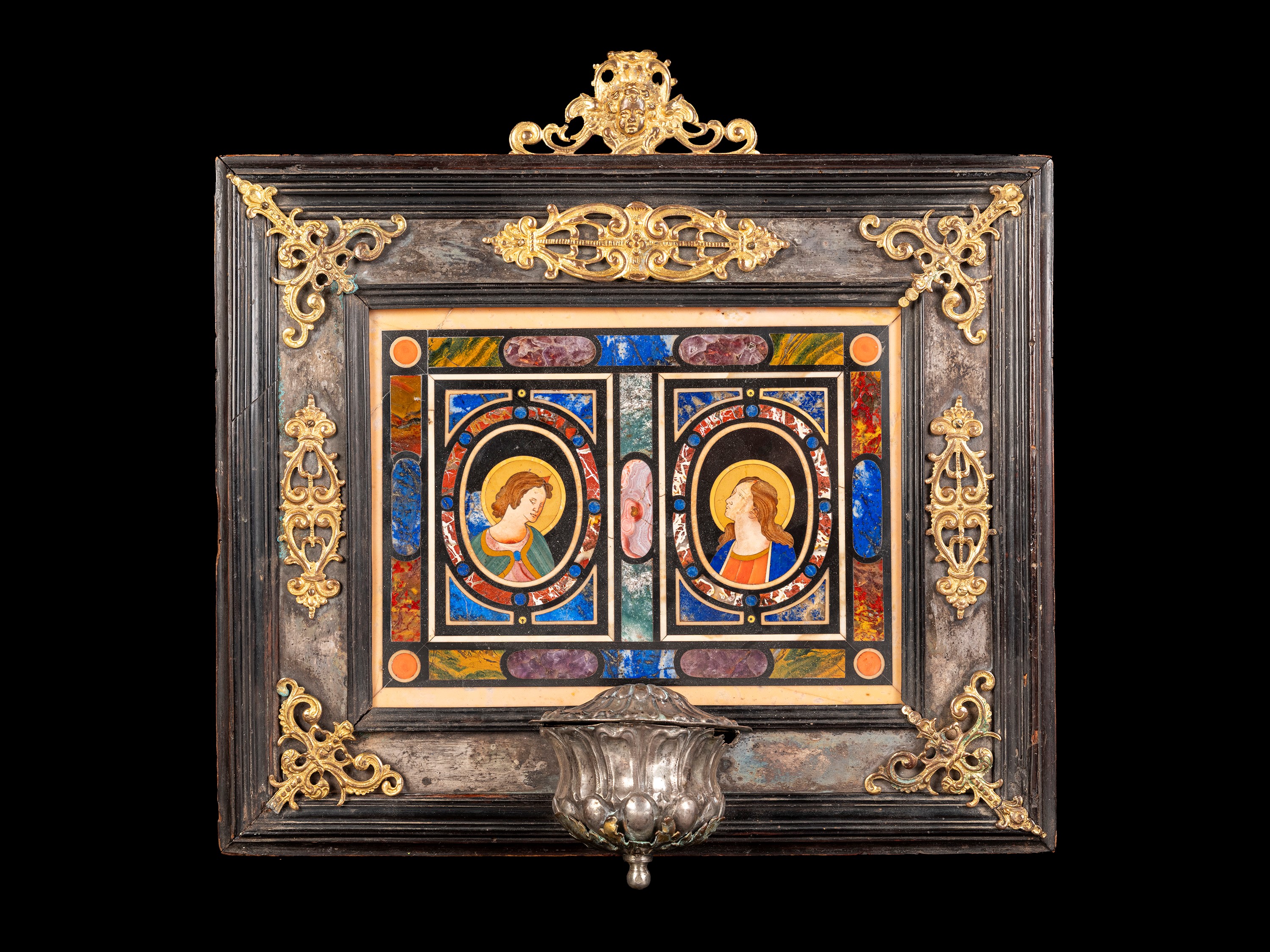 Raffigurante San Michele Arcangelo e la Vergine entro composizioni in pietre dure e marmi policromi, presentano una cornice in legno ebanizzato arricchita da finimenti in bronzo e rame dorato, con vaschetta in argento.