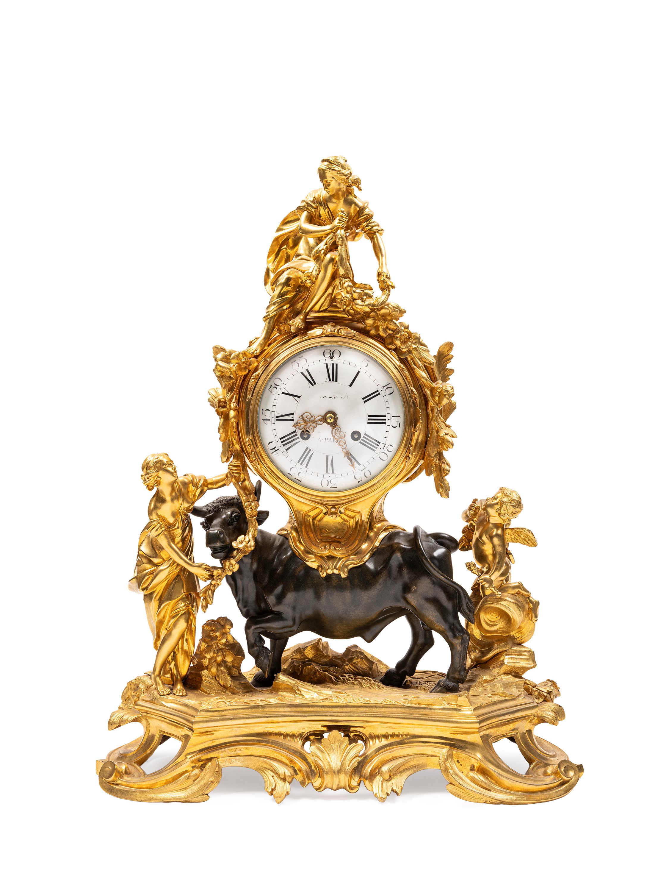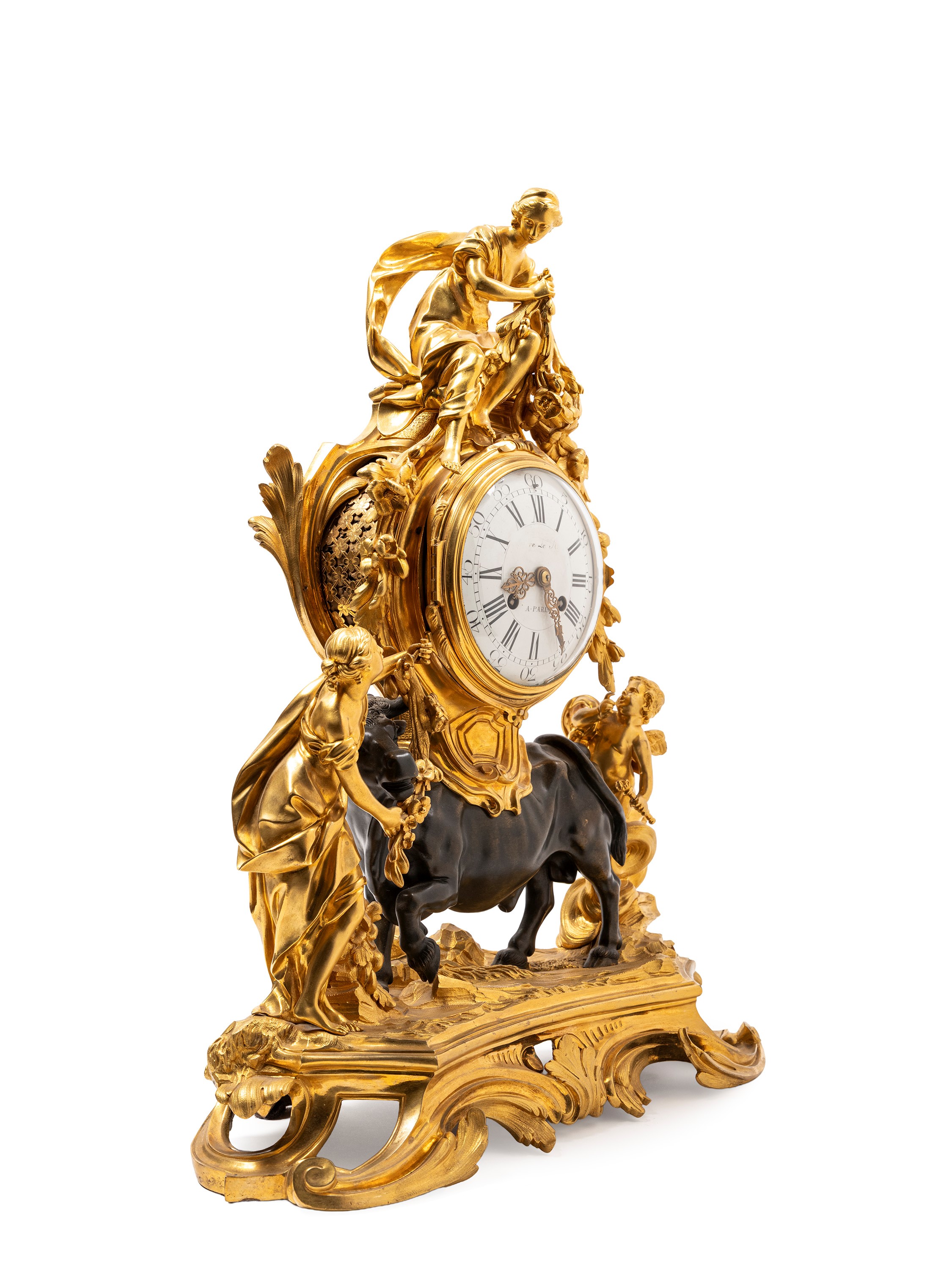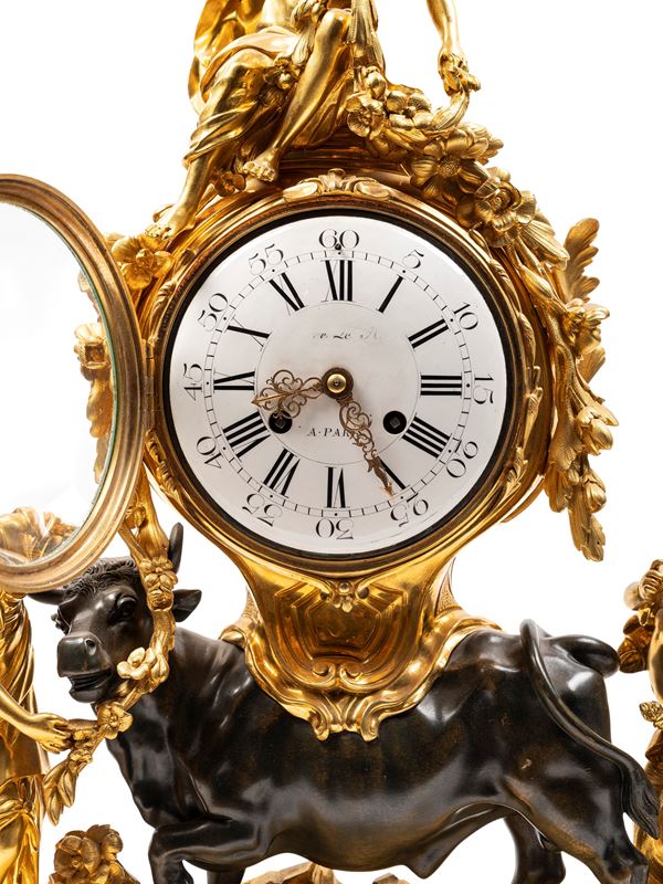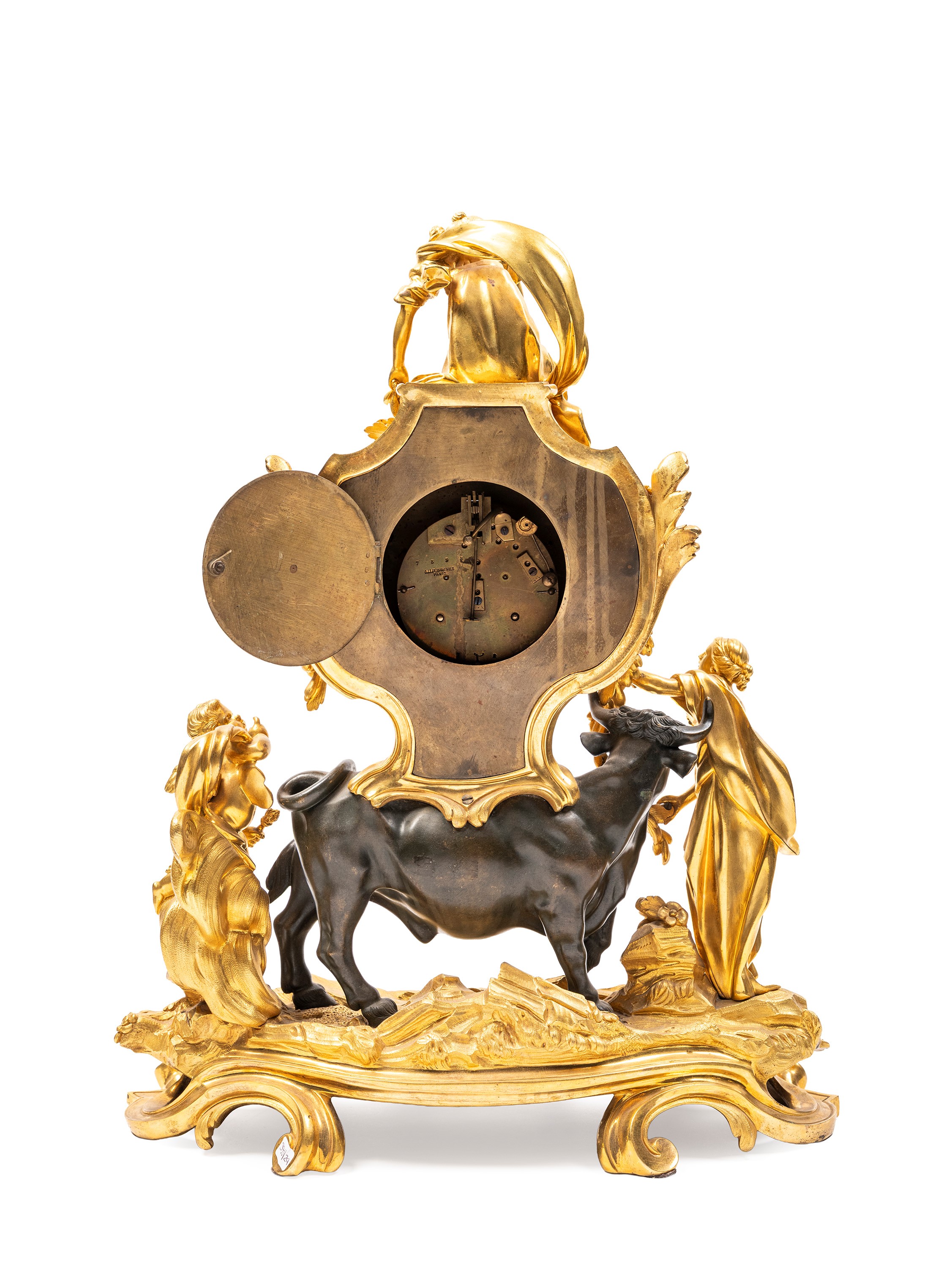 L’allegoria racconta l’episodio mitologico del rapimento d’Europa. Cassa in bronzo dorato e brunito finemente cesellata con toro che rappresenta Zeus, sovrano dell’Olimpo e la principessa Europa che osserva il divino. Meccanismo con suoneria al passaggio delle ore e mezze
