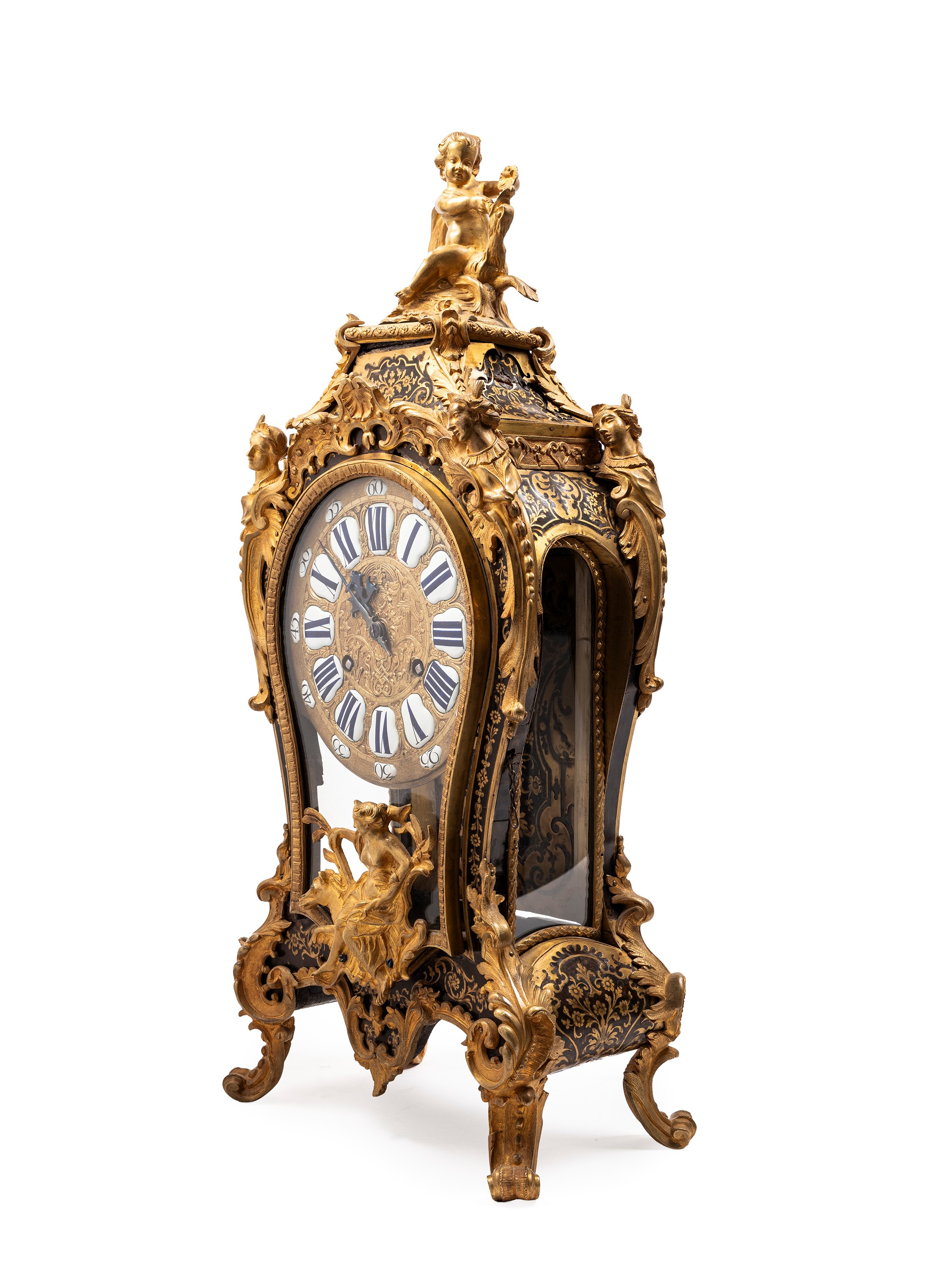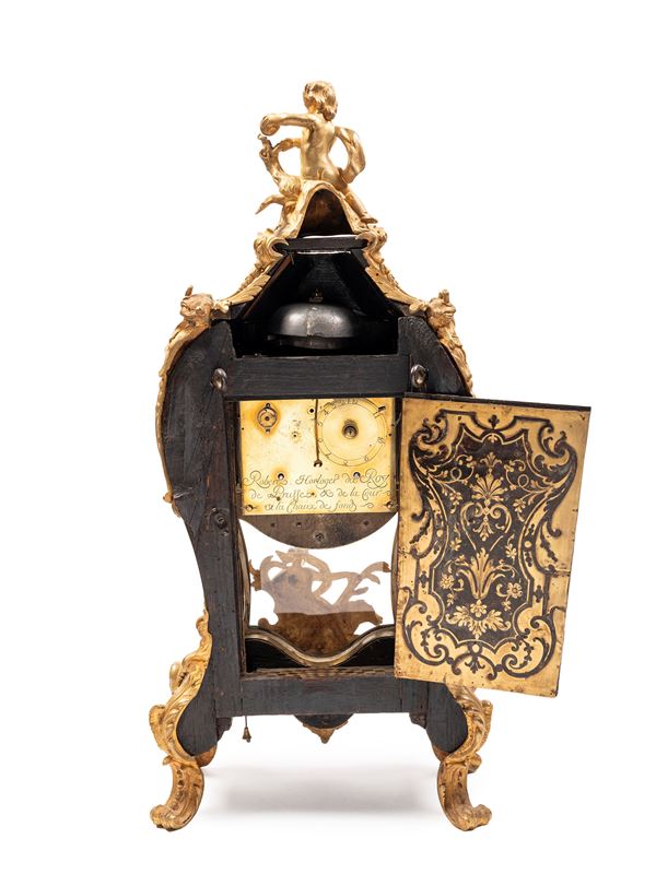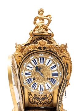 Cassa in legno, stile Boulle, in tartaruga e bronzo con quadrante con indici romani e arabi a cartouche in porcellana.