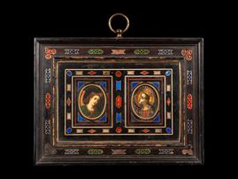 PANNELLO IN PIETRE DURE INCASTONATO ENTRO CORNICE IN EBANO CON APPLICAZIONI IN SMALTO, Firenze, XVII secolo