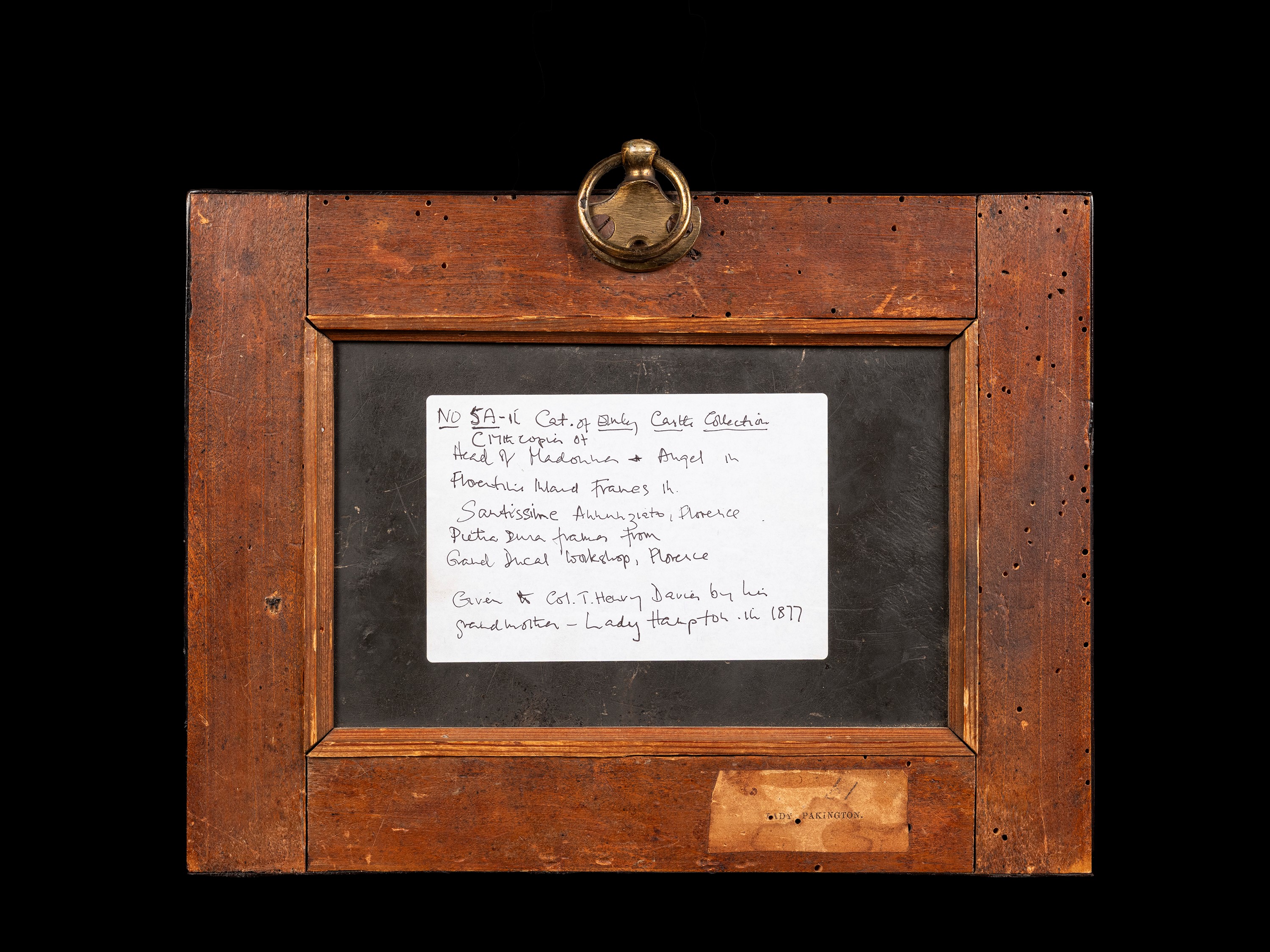 Gli inserti sono racchiusi entro bordure in pietre dure e semipreziose, articolate in elementi lineari e sagomati di varia forma, dai vivaci contrasti cromatici. La cornice, impiallacciata in ebano e profilata a modanatura, è arricchita da una sottile filettatura interna in ottone e da inserti smaltati a basse-taille nei toni del rosso, verde e blu. Al retro reca appunto con possibile provenienza.