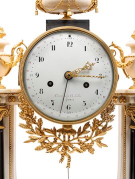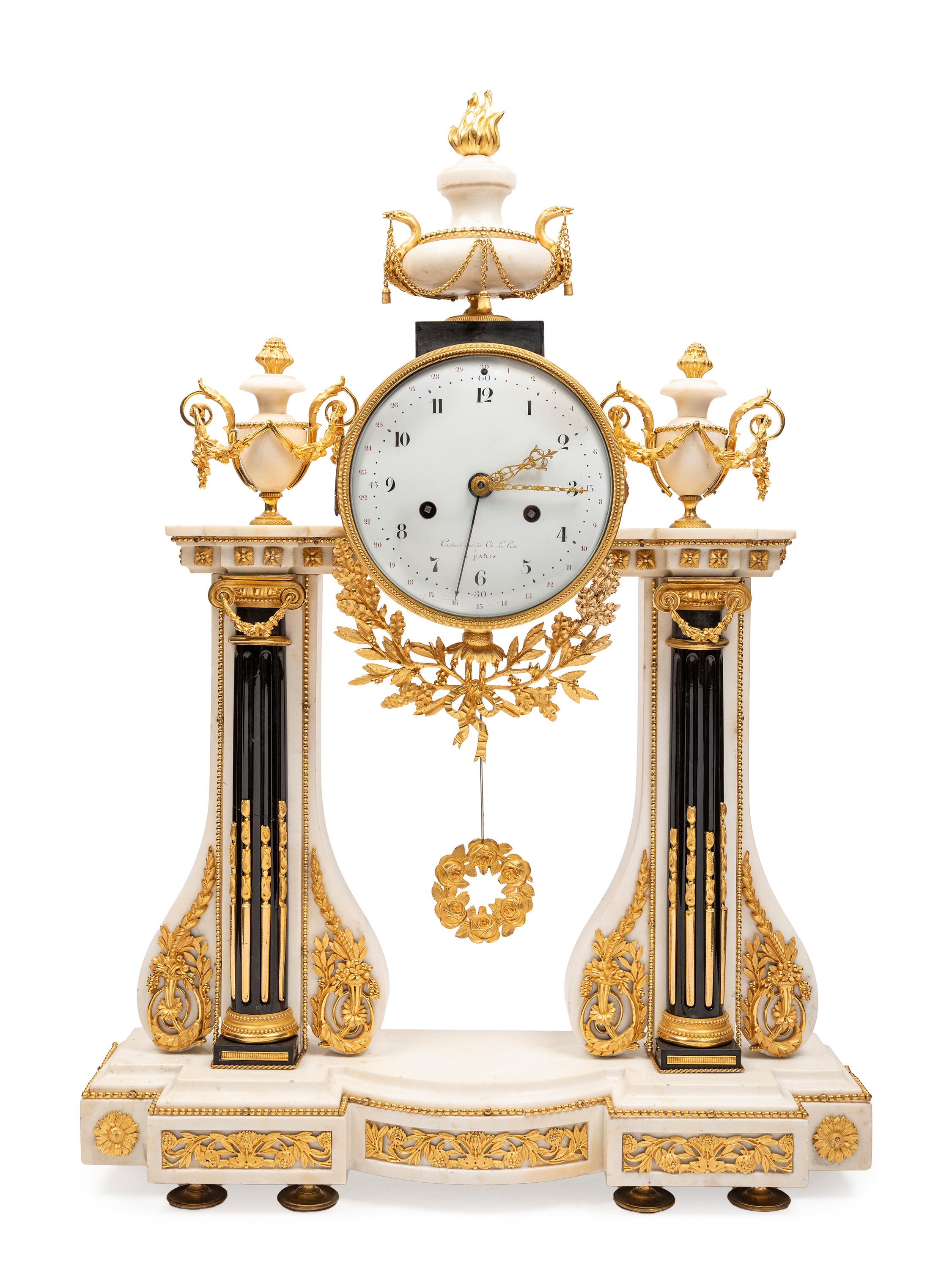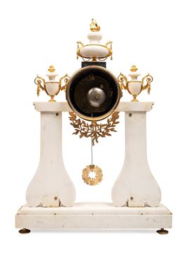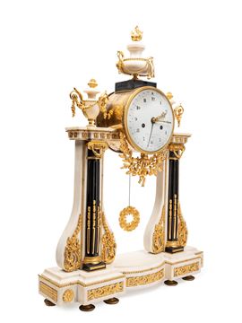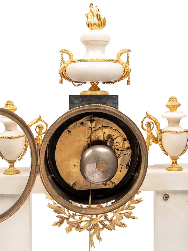 Prestigioso orologio a portico Luigi XVI in marmo bianco e nero, manifattura Parigi, epoca 1780. Movimento originale a filo del XVIII secolo, quadrante in smalto e meccanismo con suoneria delle ore e delle mezze e calendario del mese a 30 giorni. La cassa è arricchita da applicazioni finemente cesellate con ghirlande, capitelli e bassorilievi in bronzo dorato al mercurio.