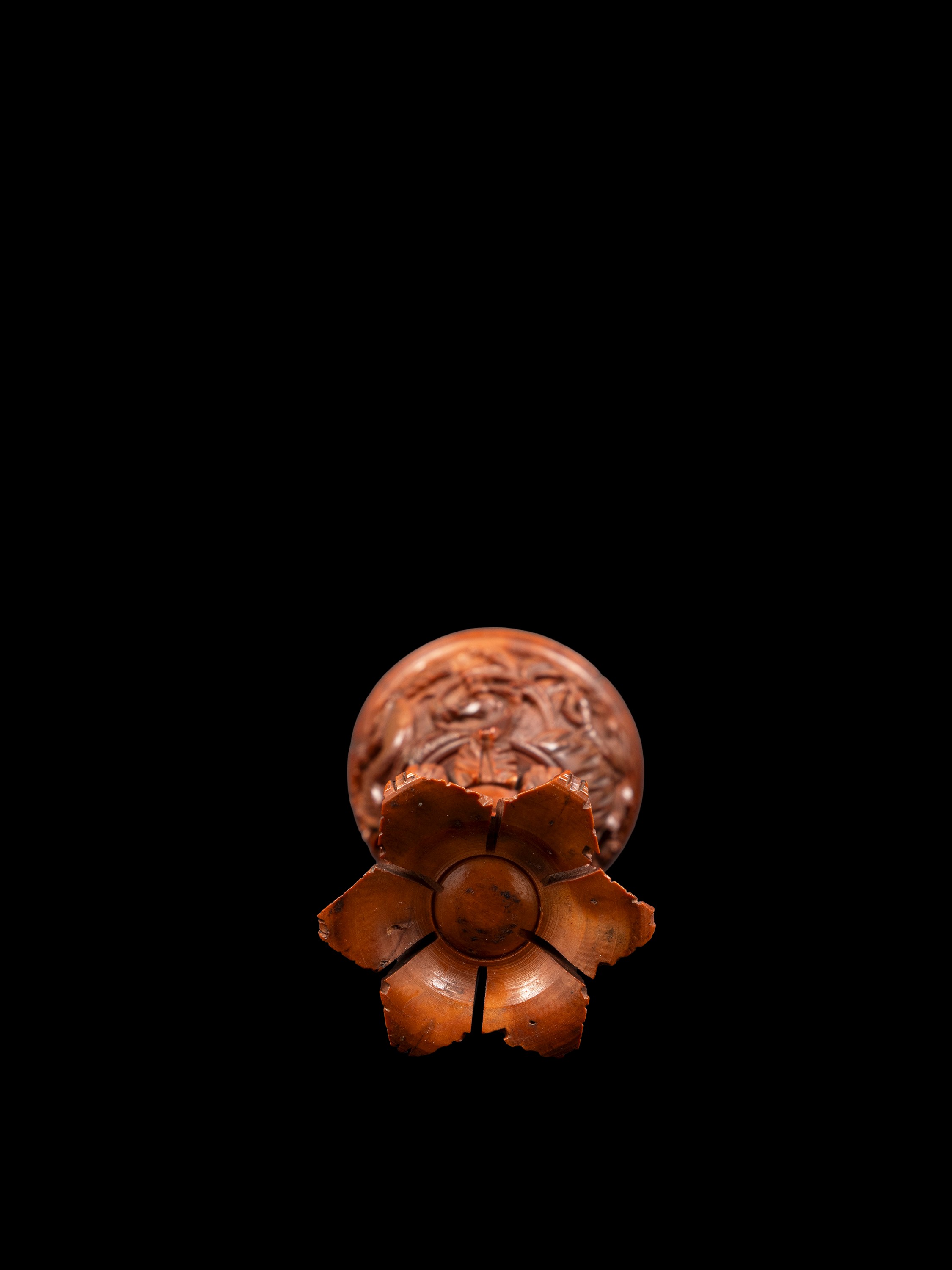 Finemente intagliato, con figure inserite tra motivi floreali, presenta un corpo a torchon e una base a petalo.