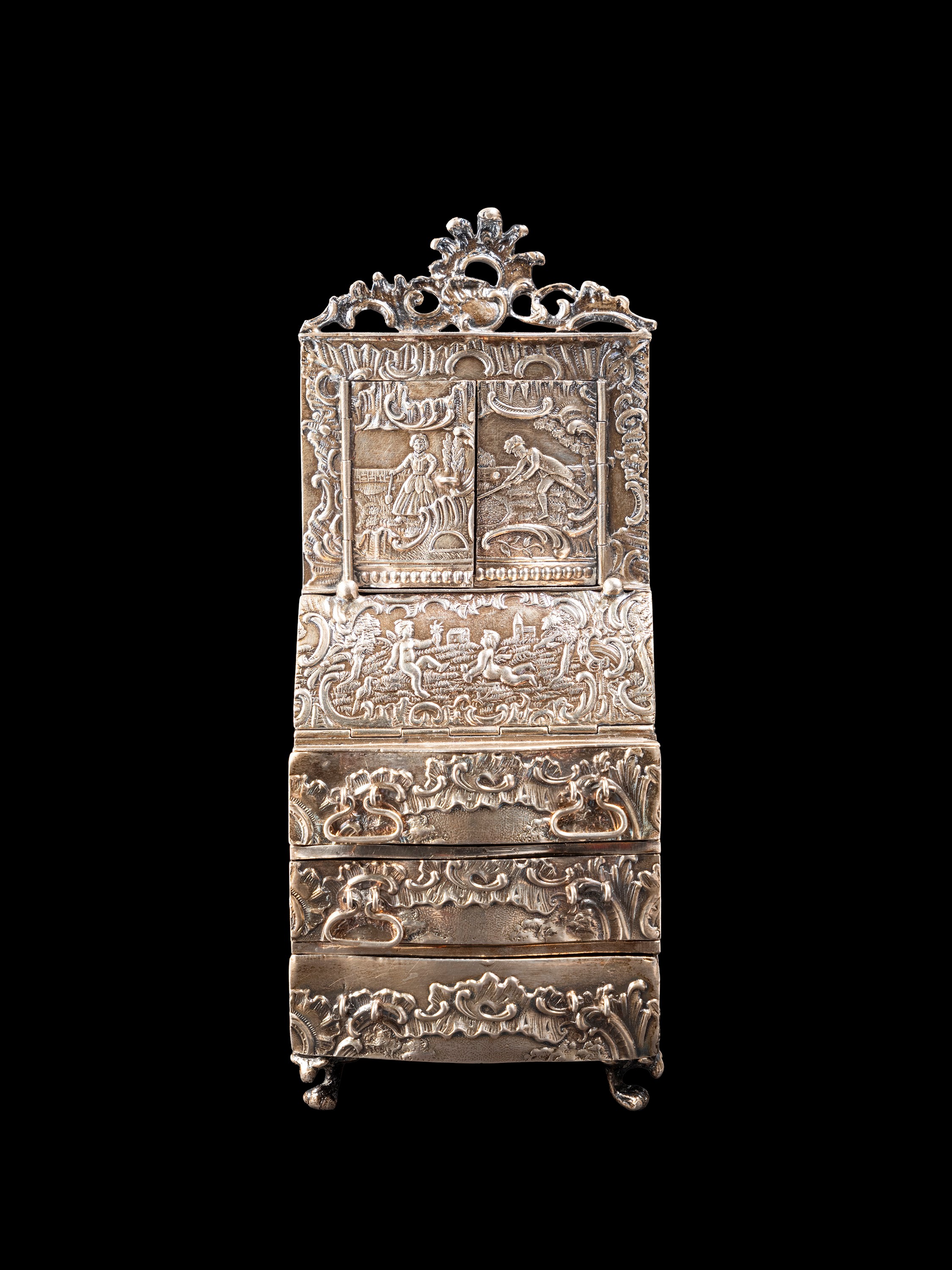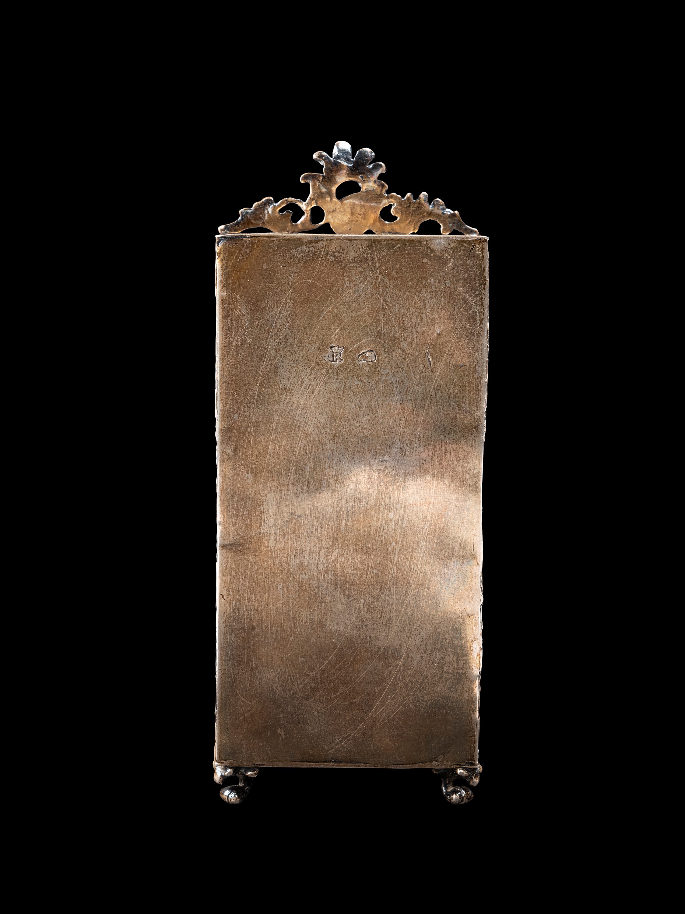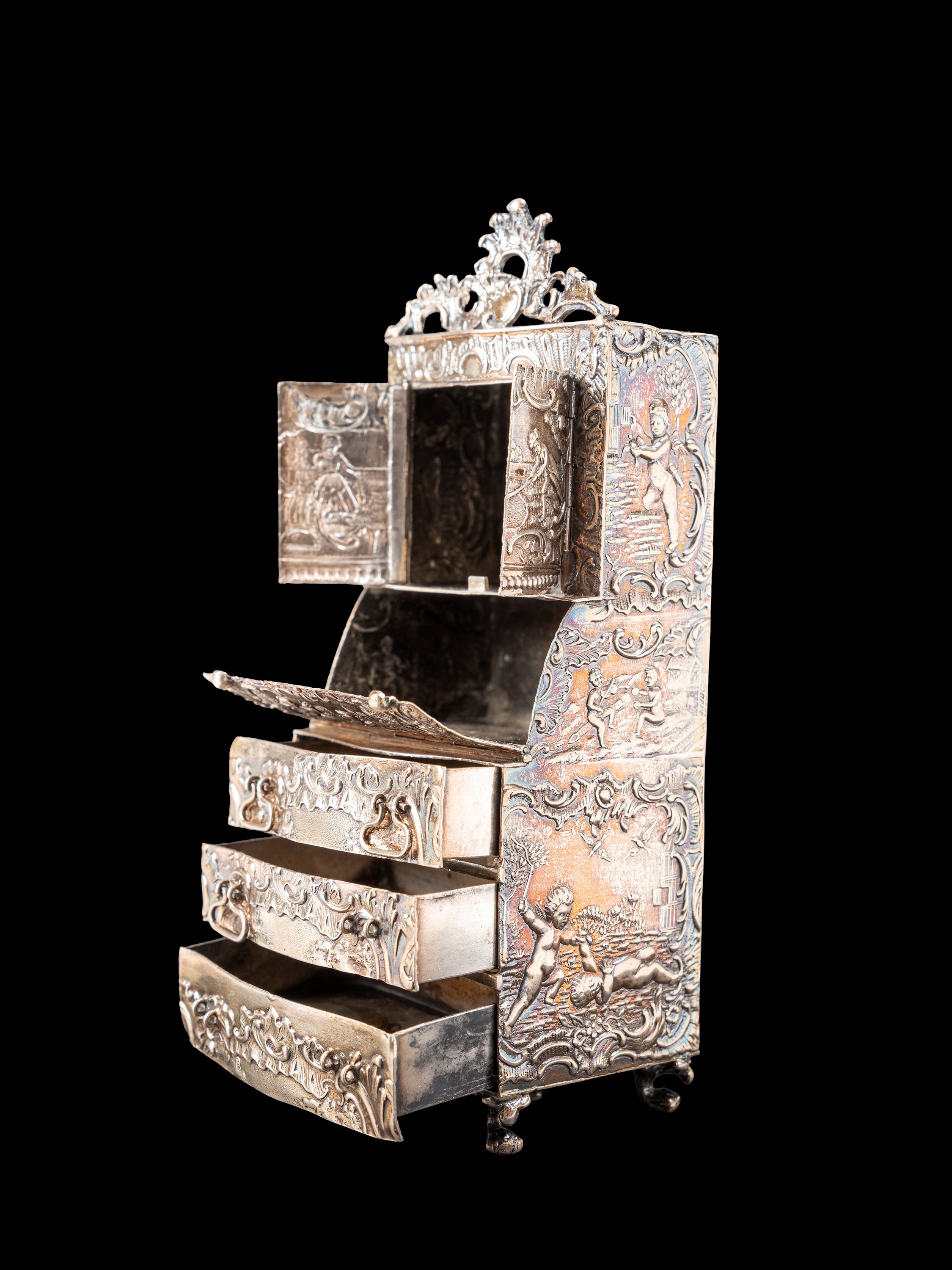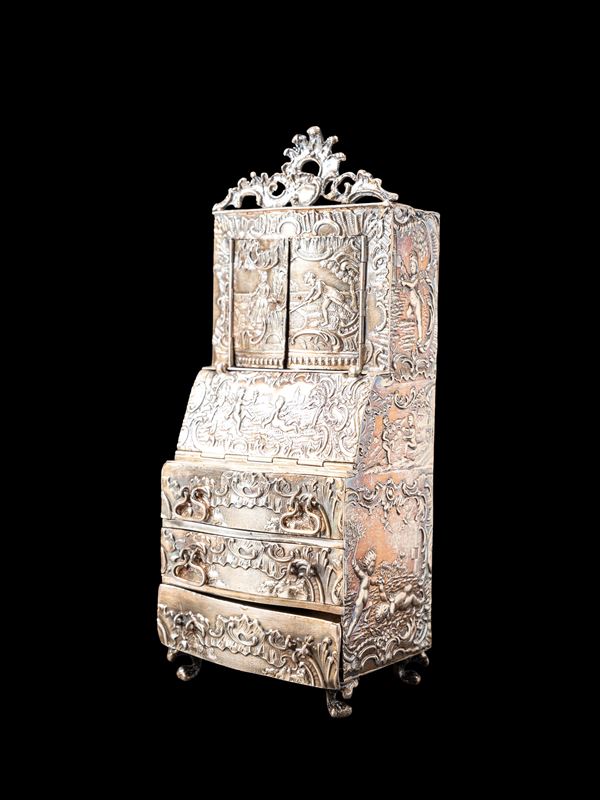 Finemente cesellato e sbalzato con scene di putti che giocano. Peso g. 300