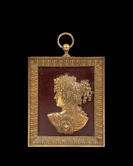 Raffigurante un volto femminile su fondo di marmo rosso, con acconciatura ornata da grappoli d’uva e tralci di vite, è avvolto da un mantello decorato con motivo leonino. Firmata al verso Camilletti.