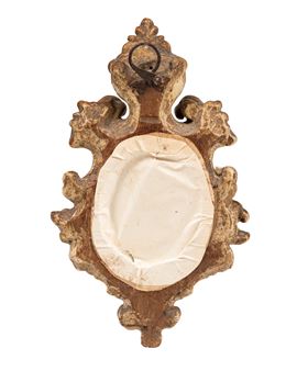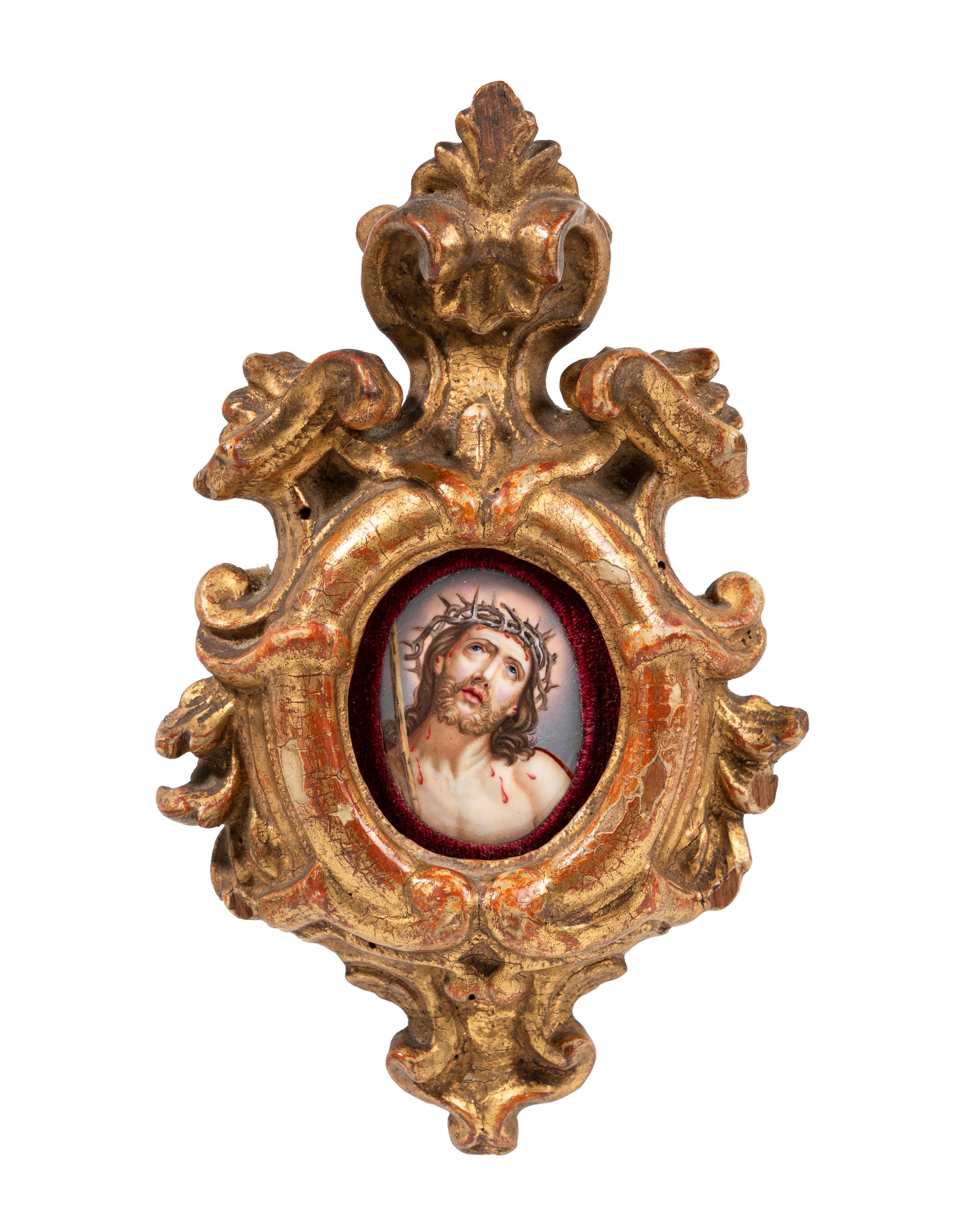 Raffigurante Cristo con corona di spine entro cornice finemente intagliata e dorata.