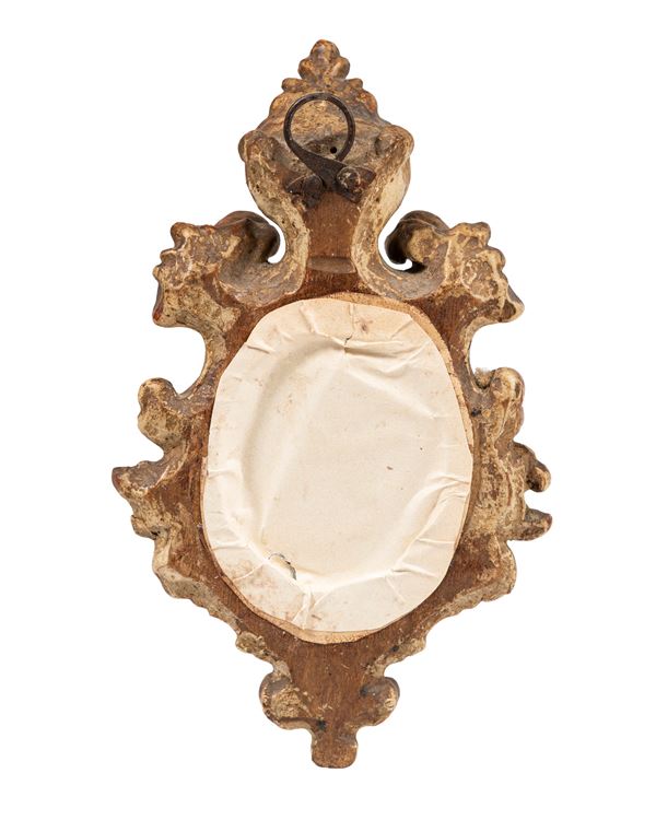 PLACCA IN SMALTO ENTRO CORNICE IN LEGNO DORATO, XVIII/XIX secolo