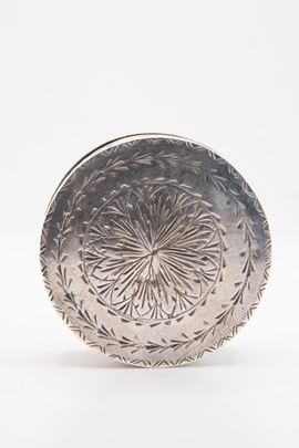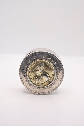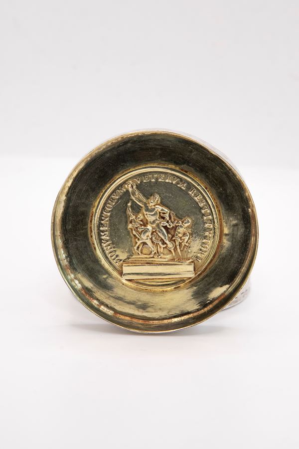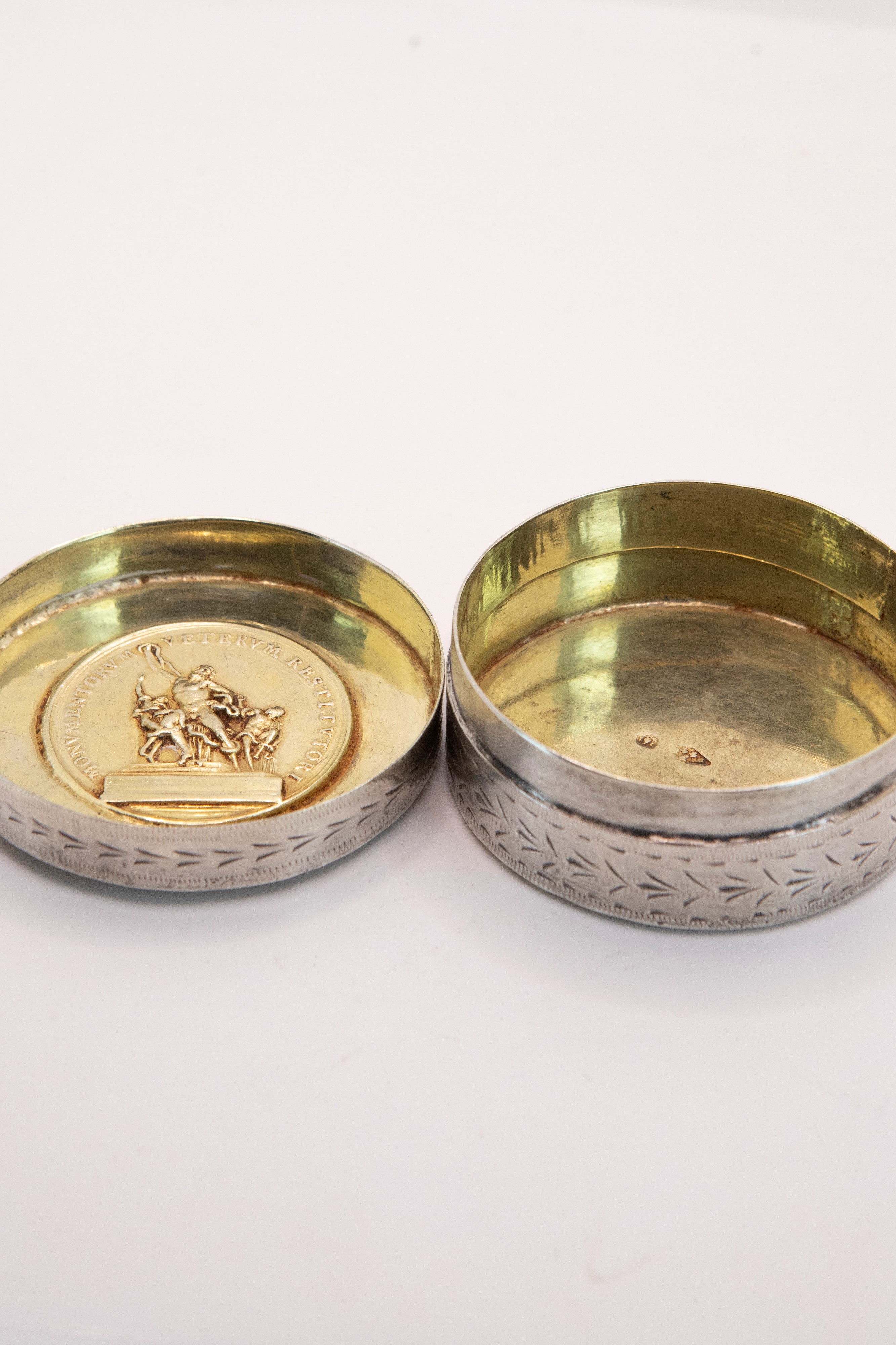 Tabacchiera in argento realizzata dall'argentiere romano Francesco De Georges (Roma 1771-1832). Sul coperchio medaglia commemorativa della restituzione delle opere d'arte da parte della Francia, recuperate da Antonio Canova; opera di Tommaso Mercadetti. Sul fronte ritratto di profilo di PIO VII con iscrizione Pio VII. PONT. MAX. ANN. XVIII. Monogramma MT. Sul retro raffigurazione del Laocoonte e iscrizione MONUMENTORUMVETERUM RESTITUTORI. Peso gr. 120.