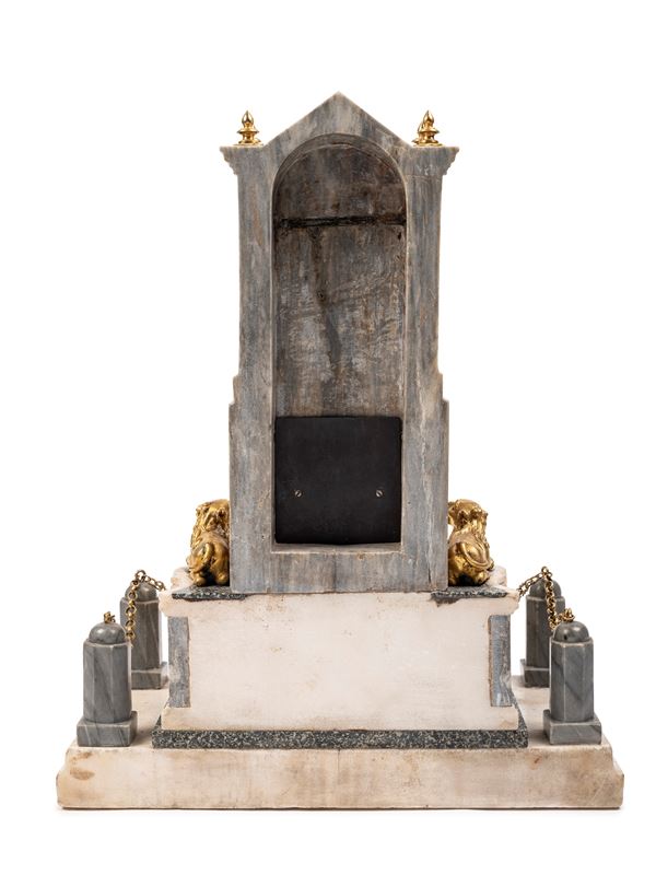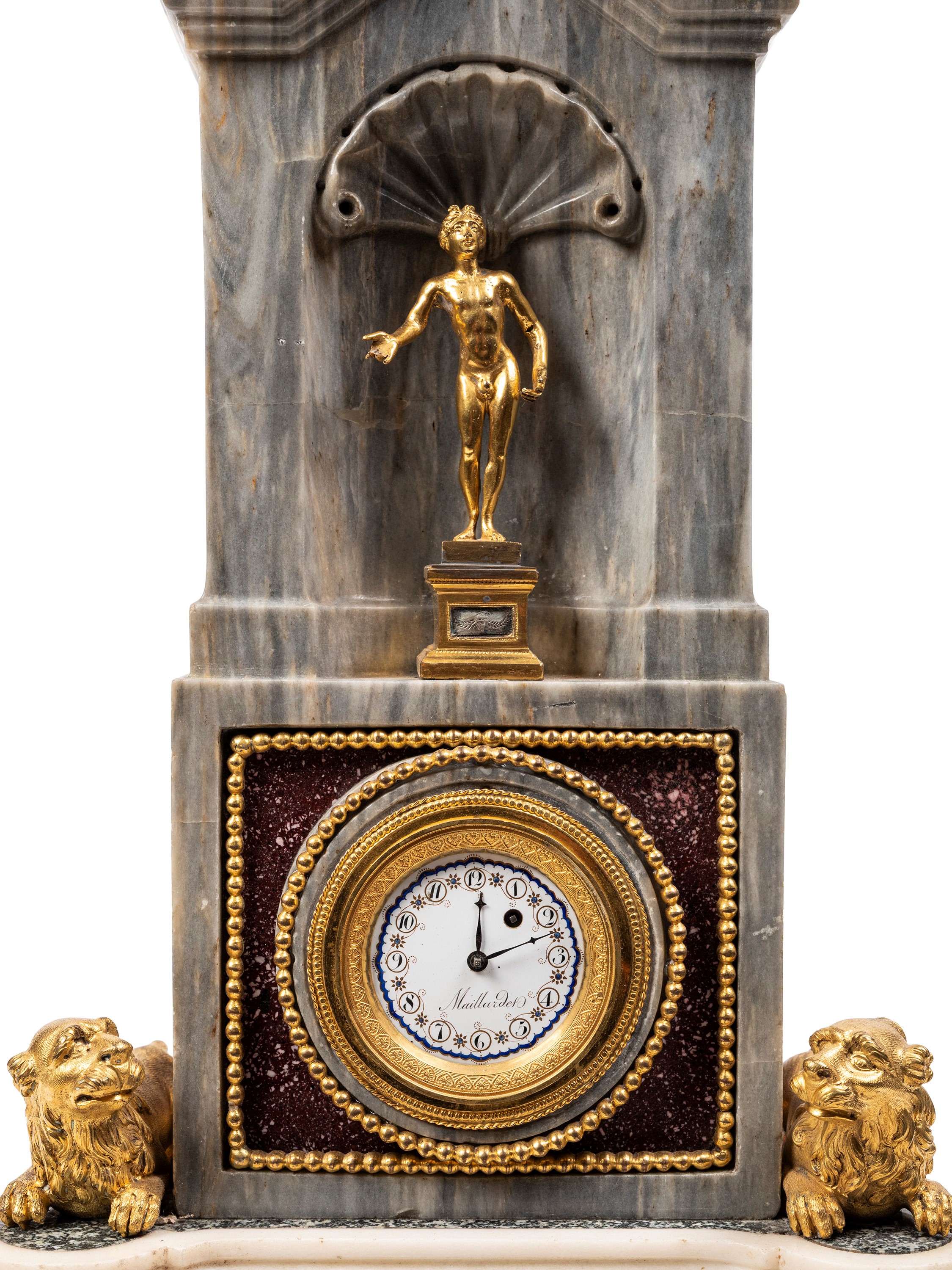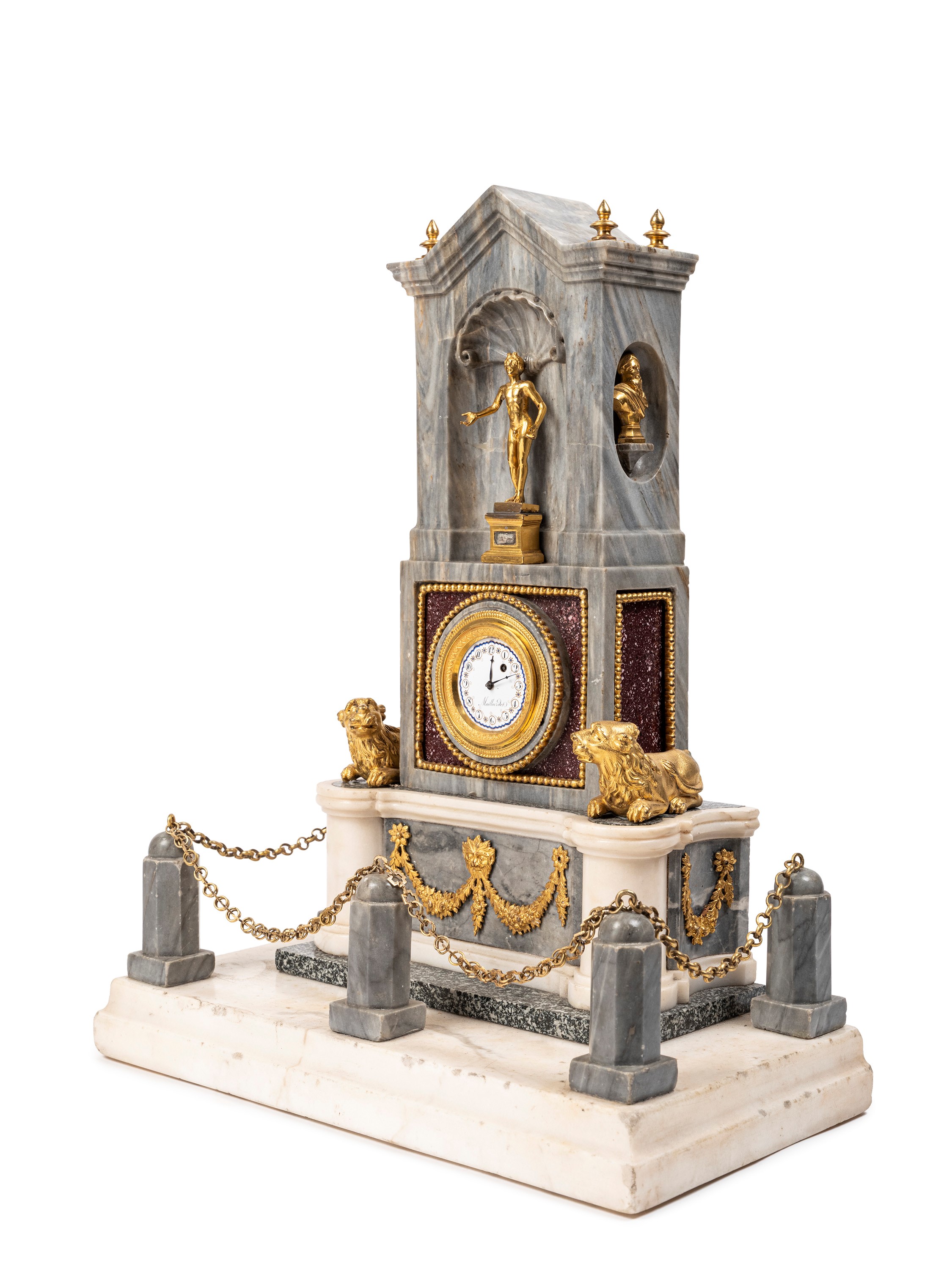 In marmo bianco e grigio del Belgio con applicazioni in bronzo finemente cesellati e dorati al mercurio, atelier di L. VALADIER, movimento da orologio a verga da tasca, carica con catena e conoide firmato Maillardet (Svizzera 1745 - Belgio 1830).