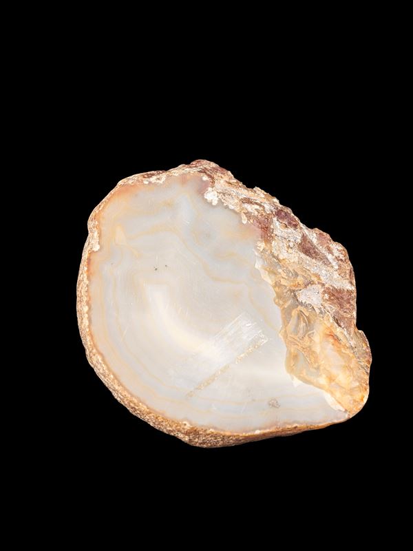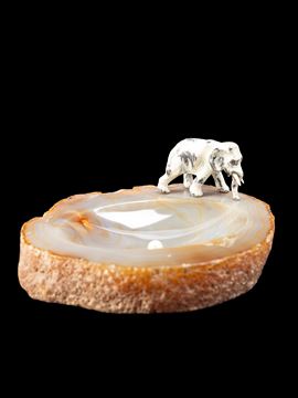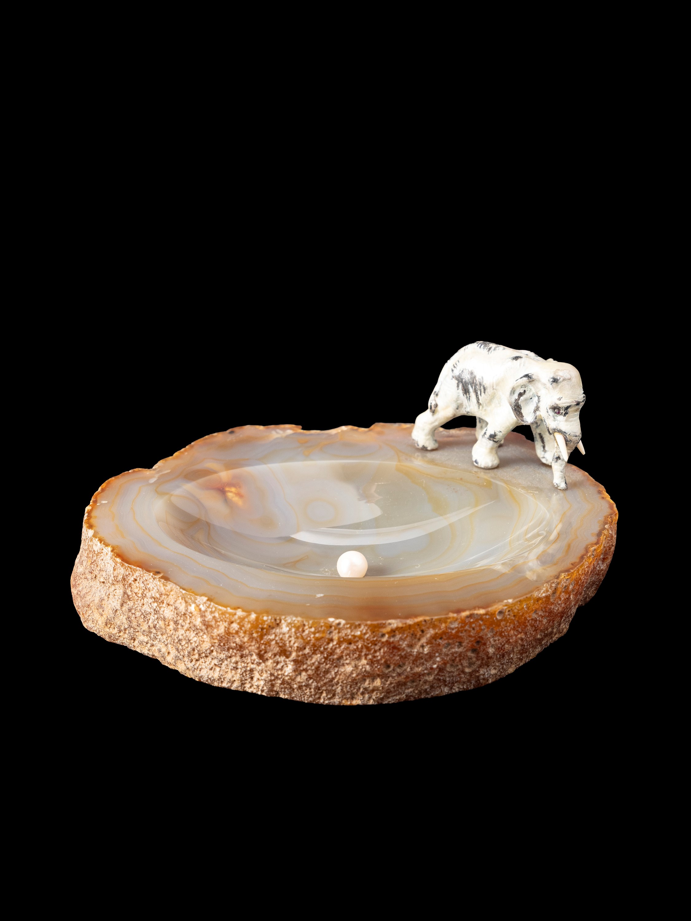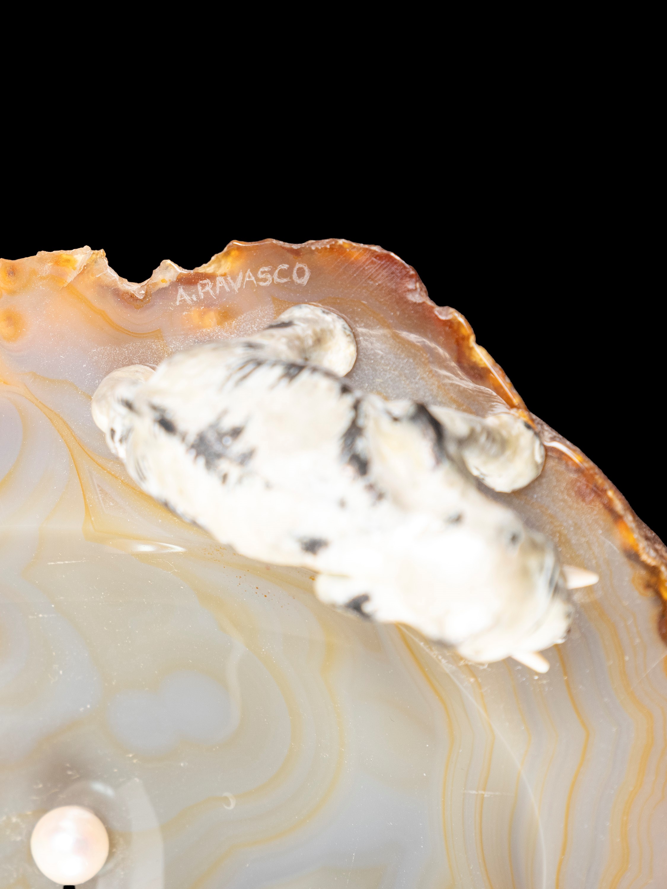 Base in corniola centrata da una perla; sul bordo un elefante smaltato con pietre dure incastonate negli occhi. Firmato A.RAVASCO.