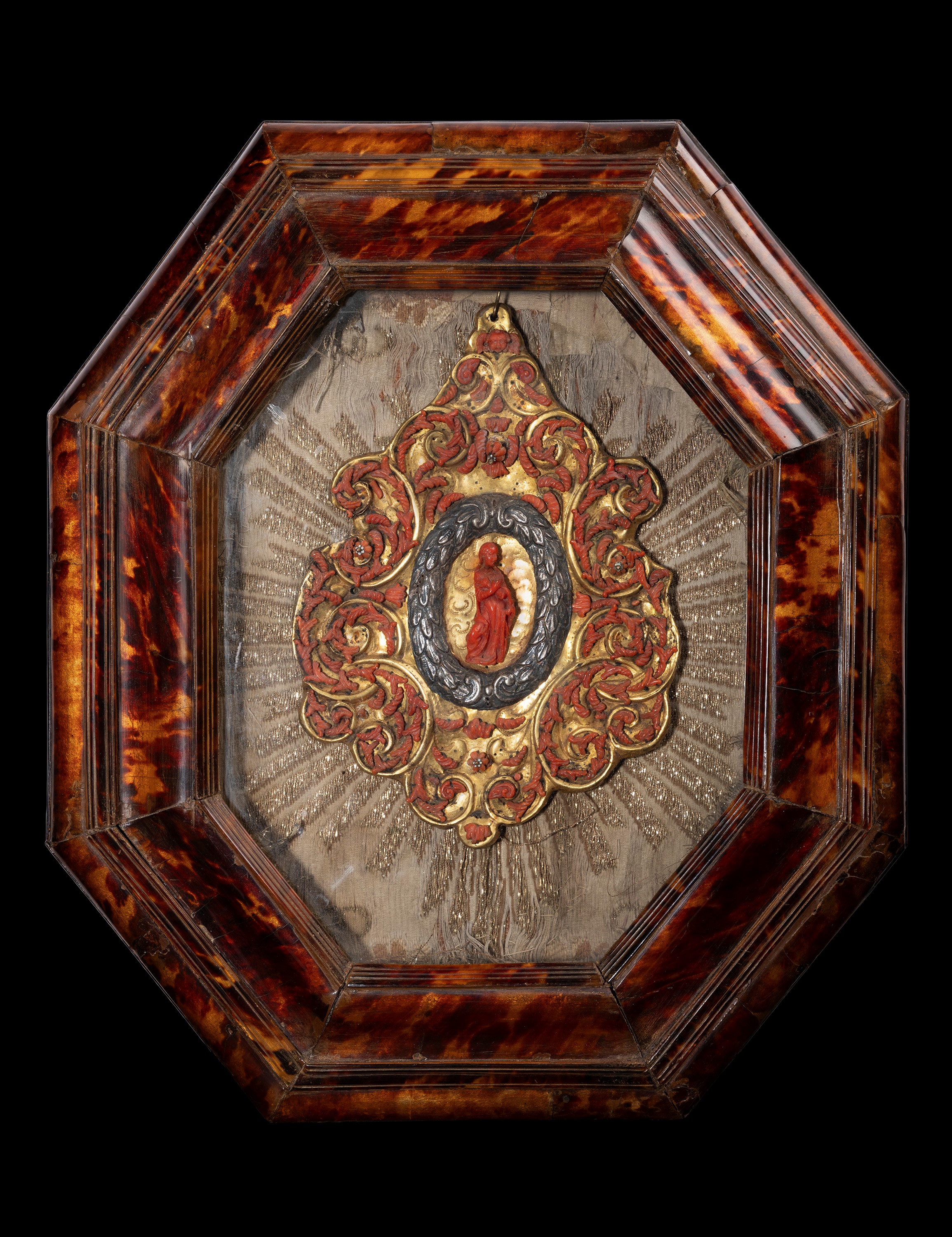 ☼RELIQUARIO IN CORALLO E RAME DORATO ENTRO TECA IN TARTARUGA, Trapani, XVIII secolo